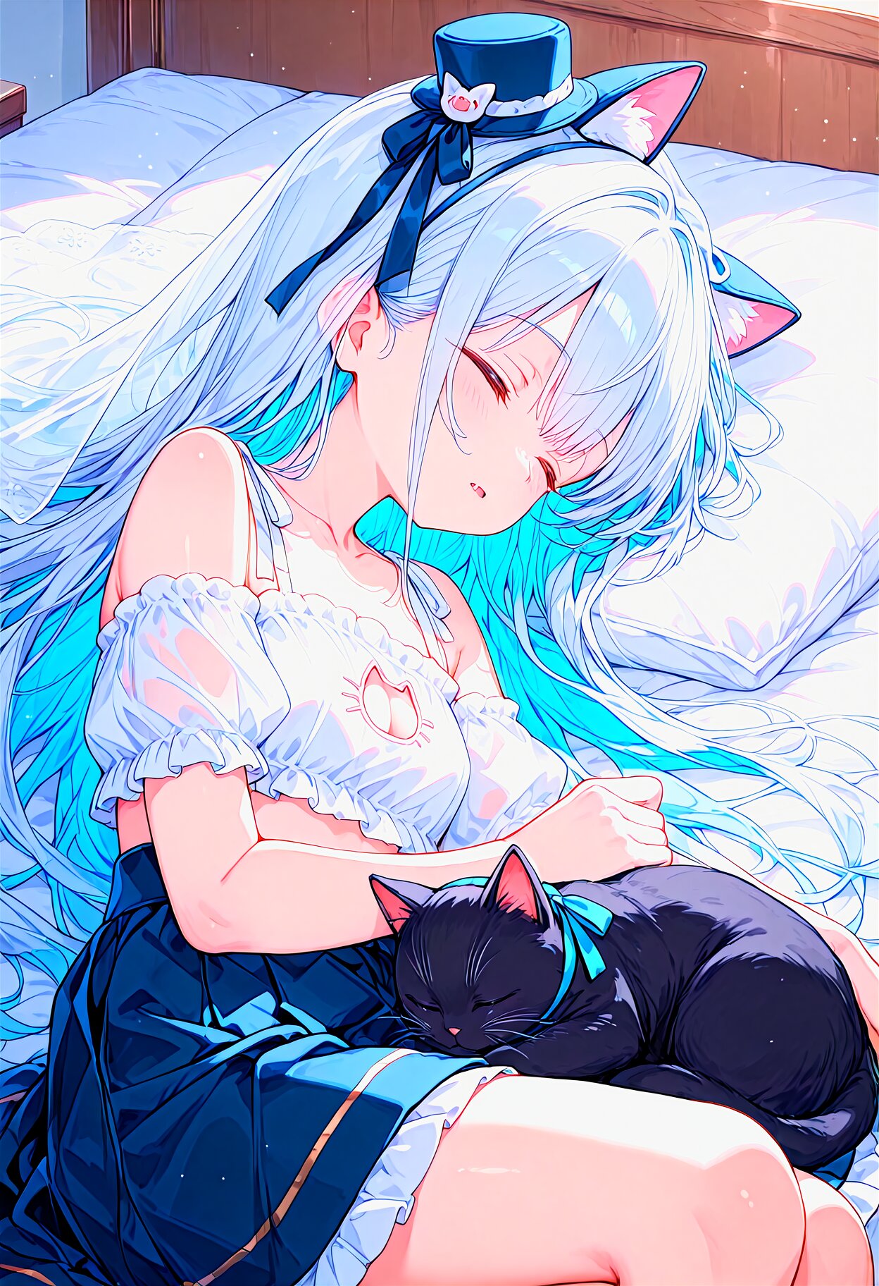 best quality, (pale color,:0.8) cowboy shot, portrait, solo, (pastel colors,:0.8), collarbone, parted lips,(Expressionless:0.8), tareme, (silver hair:1.1), (dark blue hair colored inner hair:0.8), long hair,very long hair eyebrows visible through hair, white off-shoulder and dark blue skirt, mini hat,strapping ribbon, see-through veil, cat lingerie, (one cat,:1.2) on bed, bedroom, sleeping, curled up to sleep, Bend knees, fake cat ears, fang, from side, (profile:0.7), <lora:sdxl2-flat2-512b:-1.2> <lora:noline-16oa:-1.25>