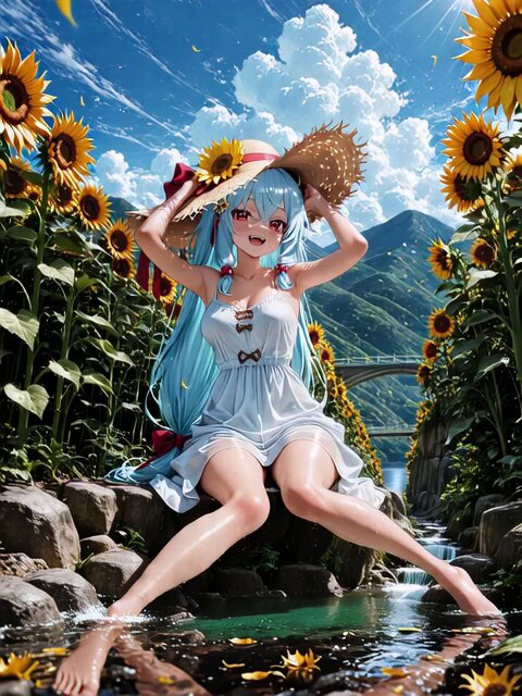 A cute anime-style girl is sitting by a clear stream surrounded by tall sunflowers, holding her straw hat as a gentle breeze flows. Her long blue hair and white dress flutter softly in the wind. The sunflowers sway gently, clouds slowly move across the bright summer sky, and the sparkling water reflects the light. She smiles sweetly while splashing water with her feet. The atmosphere is bright, cheerful, and relaxing – a perfect summer day.