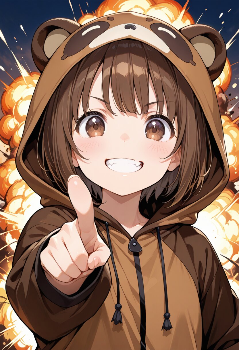 masterpiece, 1girl, solo, chibi, brown short hair, bangs, tanuki kigurumi, pointing viewer, grin, fang, upper body, explosion background