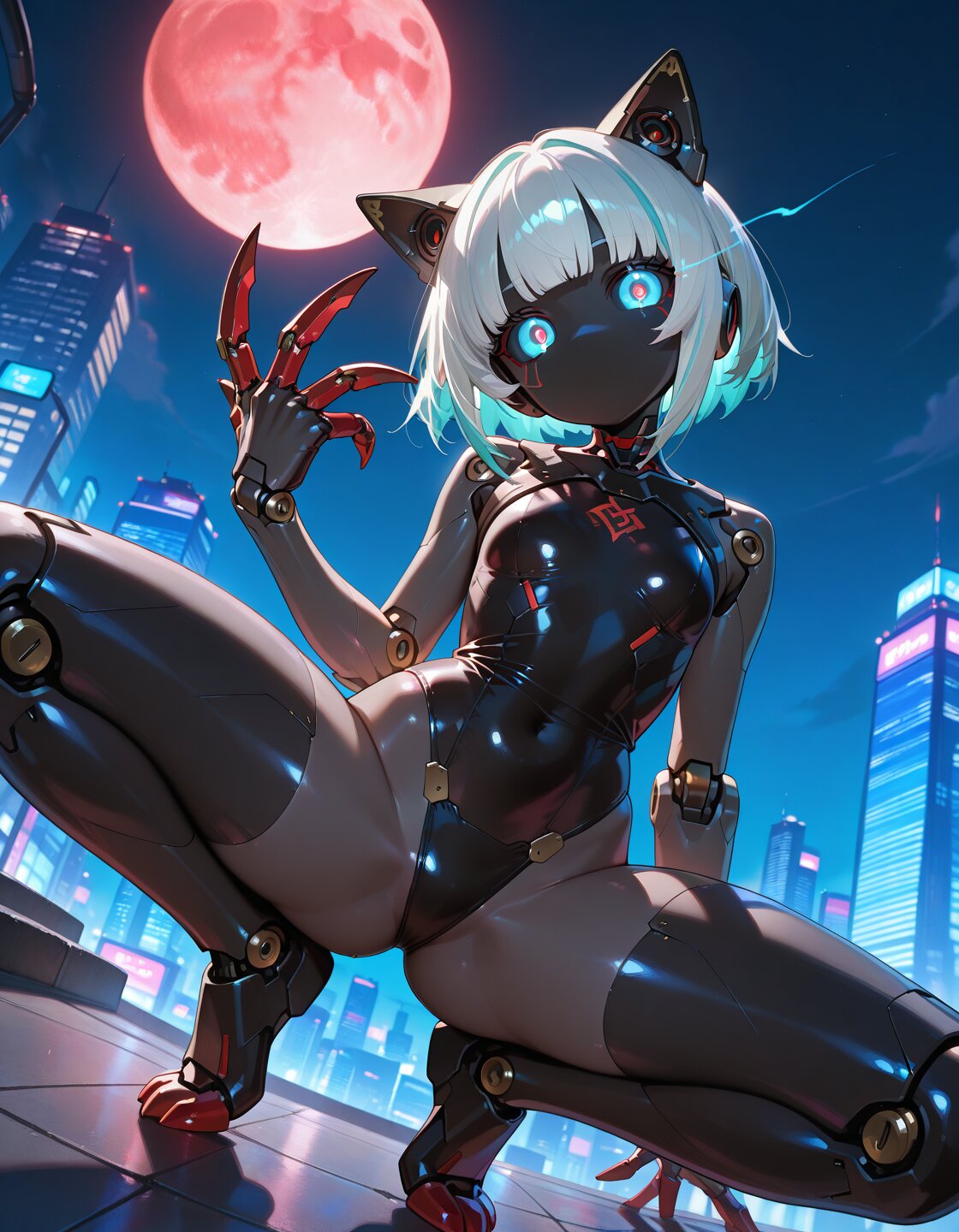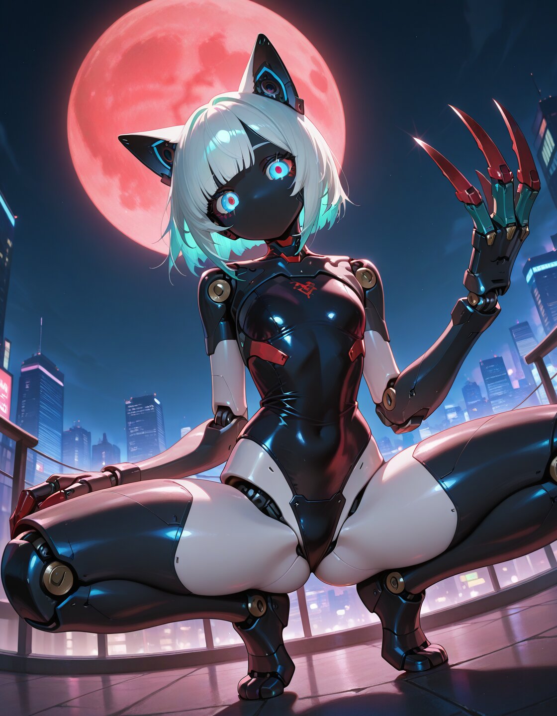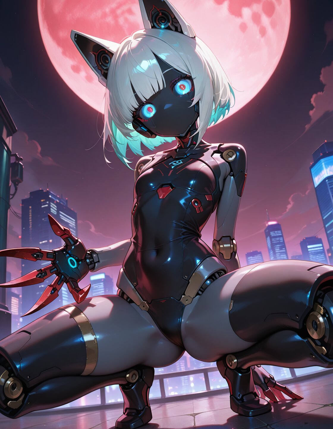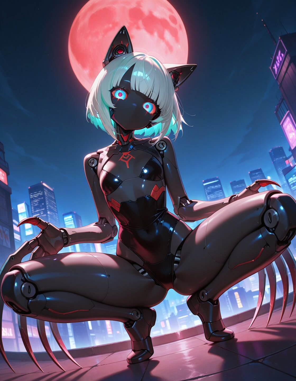 1girl, sensitive, fantasy, cyberpunk, robot girl, (robot joints:1.1), mechanical body, mechanical arms, mechanical legs, fisheye, black skin, mechanical skin, (beautiful eyes, detailed eyes), looking at viewer, solo, cute, head tilt, cowboy shot, dutch angle, night, skyline, red moon, full moon, mechanical face, black face, mechanical eye, blue eyes, eye trail, glowing eyes, no sclera, cat ears, no nose, no mouth, flat chest, small breasts, colored inner hair, short hair, aqua hair, silver hair, squatting, spread legs, tiptoes, red claw \(weapon\), lazypos, masterpiece, best quality, amazing quality,