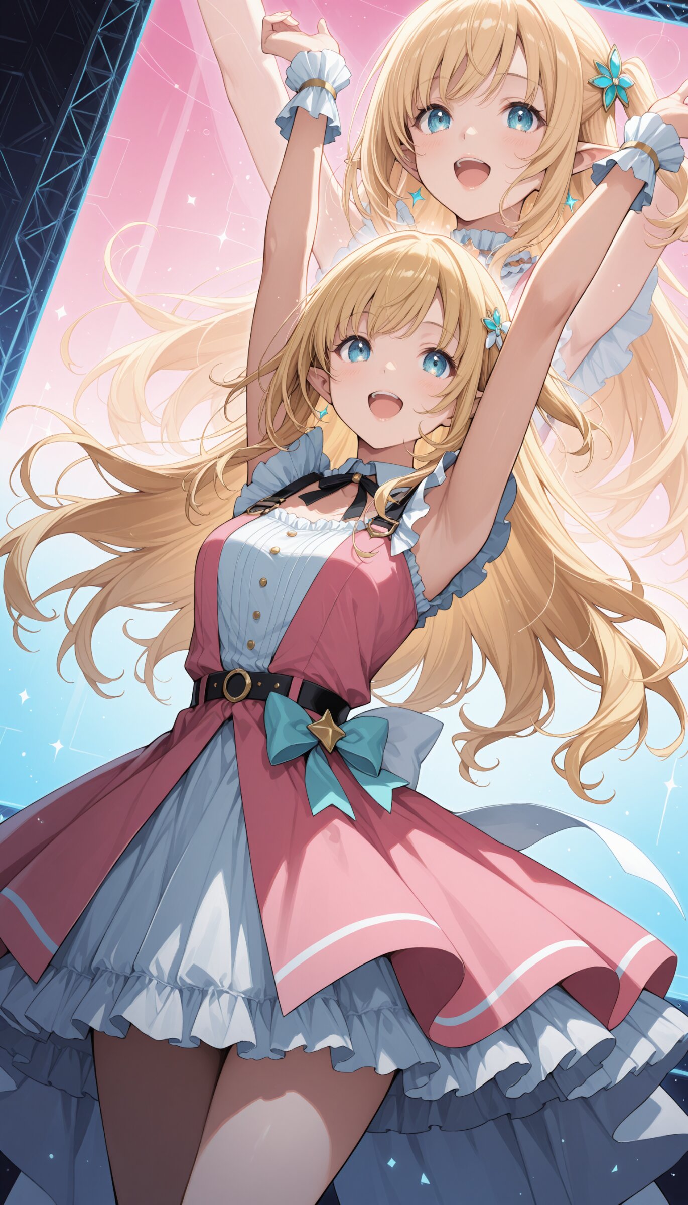 score_9, score_8_up, score_7_up, source_anime, An illustration reminiscent of a movie poster. cowboy shot, dynamic angle, dynamic composition, she is a wearing a pink colored dress style idol costume with lot of frill. Virtual youtuber, v-tuber, she is singing and dancing, The background is cyberspace. Digital effects such as holograms and glitches evoke a virtual world. The bright, shining colors express hope and the future. The overall impression is sophisticated and clean, ultra detailed lips, ultra detailed face and hair, A kawaii, adorable, cute, elf girl, (apatite eyes with CGI Effect), (deep blonde hair:1.2), masterpiece, amazing quality, very aesthetic, high resolution, ultra-detailed, absolute, newest, 2d, semi-realistic, moe heroine, sharp focus,
