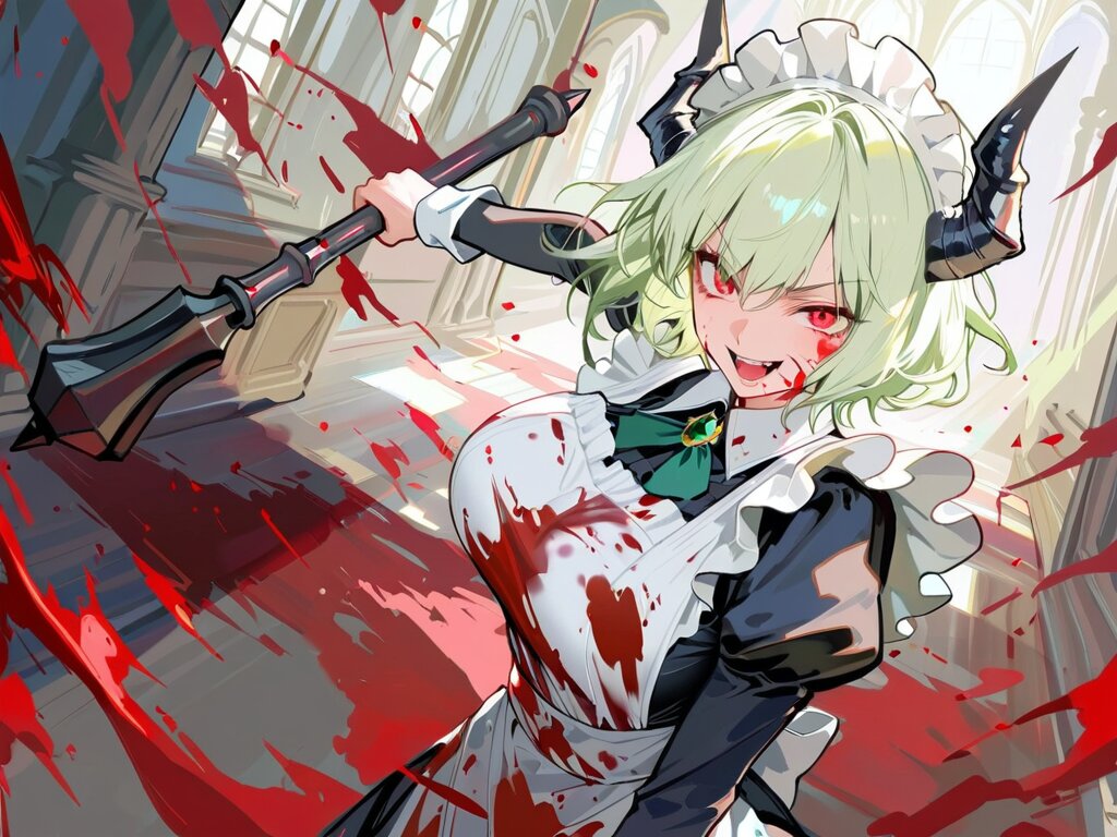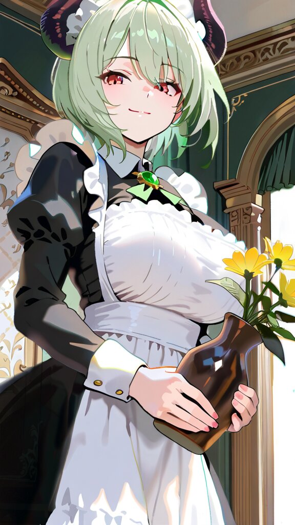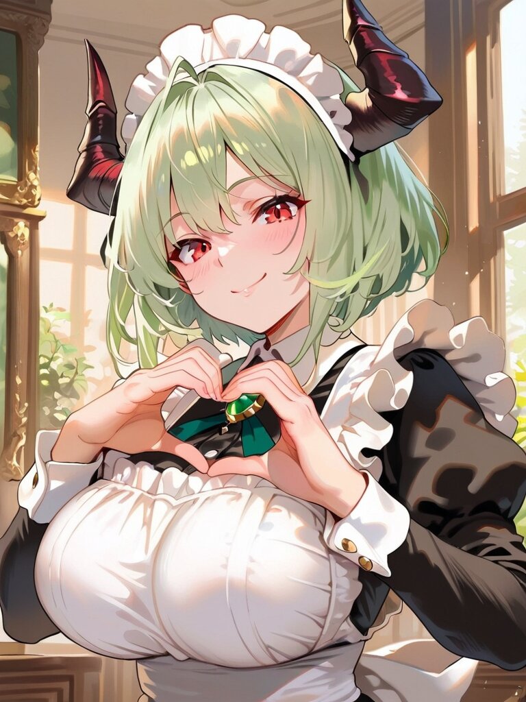 1girl, demon horns, light-green hair, short bob, red eyes, smile, closed mouth, heart hands, huge breasts, green ribbon tie(emerald brooch), maid uniform, maid brim, Victorian Maid, maid apron *HassakuXLを使用しています。加筆修正をしている為、そのまま入力しても出力されない可能性があります。
