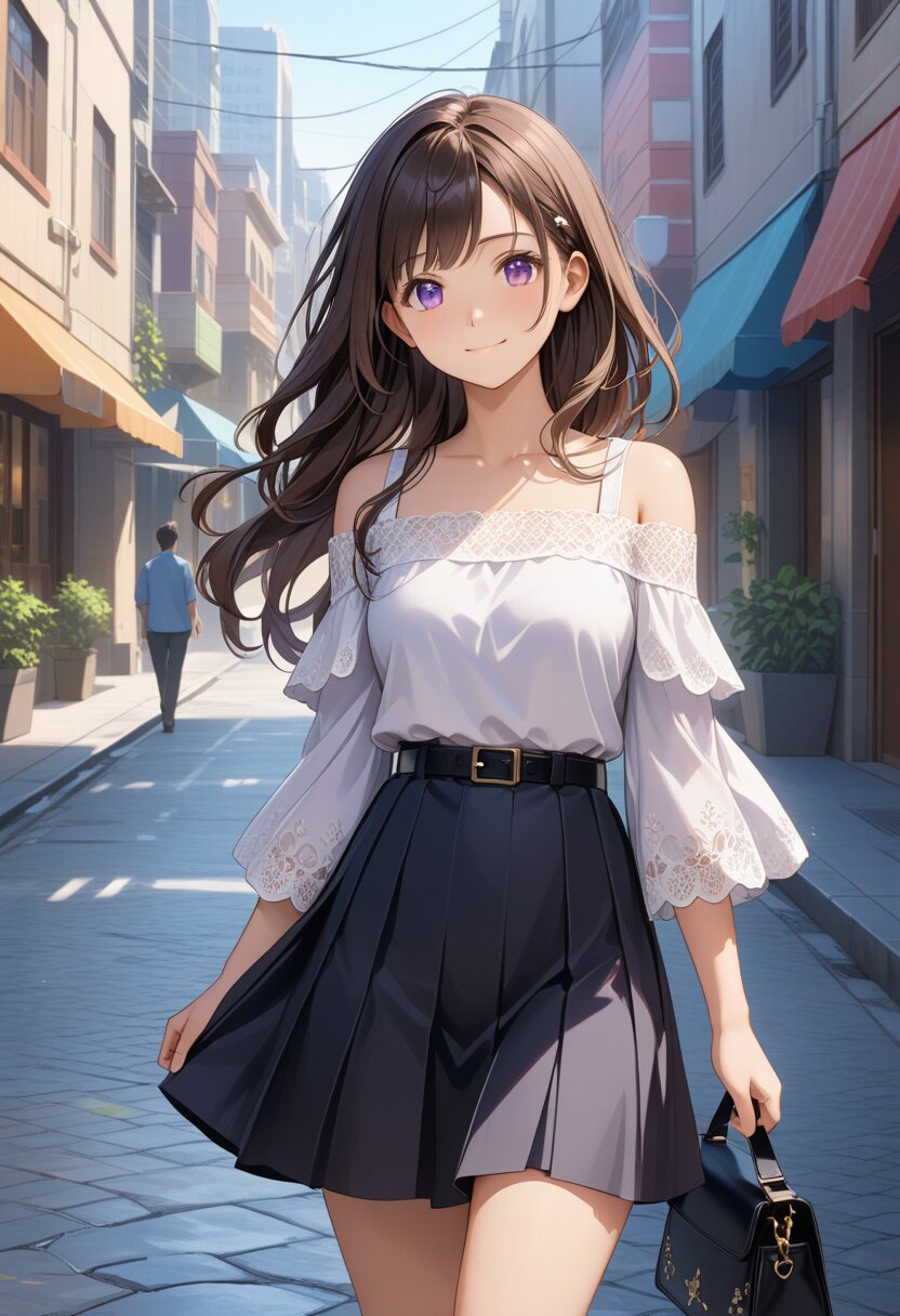 masterpiece,high resolusion,illustration,ultra detailed 8k art,Anime girl (ethnicity:1.2), (age:1.1), (detailed clothing:1.2), (accessories:1.1), (facial features:1.3), (expression:1.2), (body type:1.1), (pose:1.2), standing outdoors, looking directly at viewer, light-skinned, medium build, smiling, long dark hair, flowing, (detailed hair:1.2), light purple eyes, light makeup, wearing off-the-shoulder white blouse with lace details, black skirt with layered lace, black belt, and light-colored shoes, holding a small dark bag, city street scene, pastel color palette, soft lighting, soft focus in background, urban environment, light colored buildings, blurred background, whitish/grayish tones, anime style, (detailed skin texture:1.2), photorealistic style, digital art, (detailed clothing folds:1.2), (shoes:1.1).