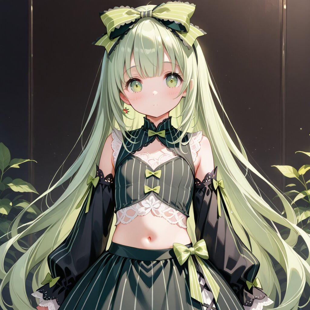cute,loli,1girl,short black white sleeves,pale green very long hair,green eyes,hair bow,vertical-striped black dress,green bow,pinstripe pattern,white lace,midriff,