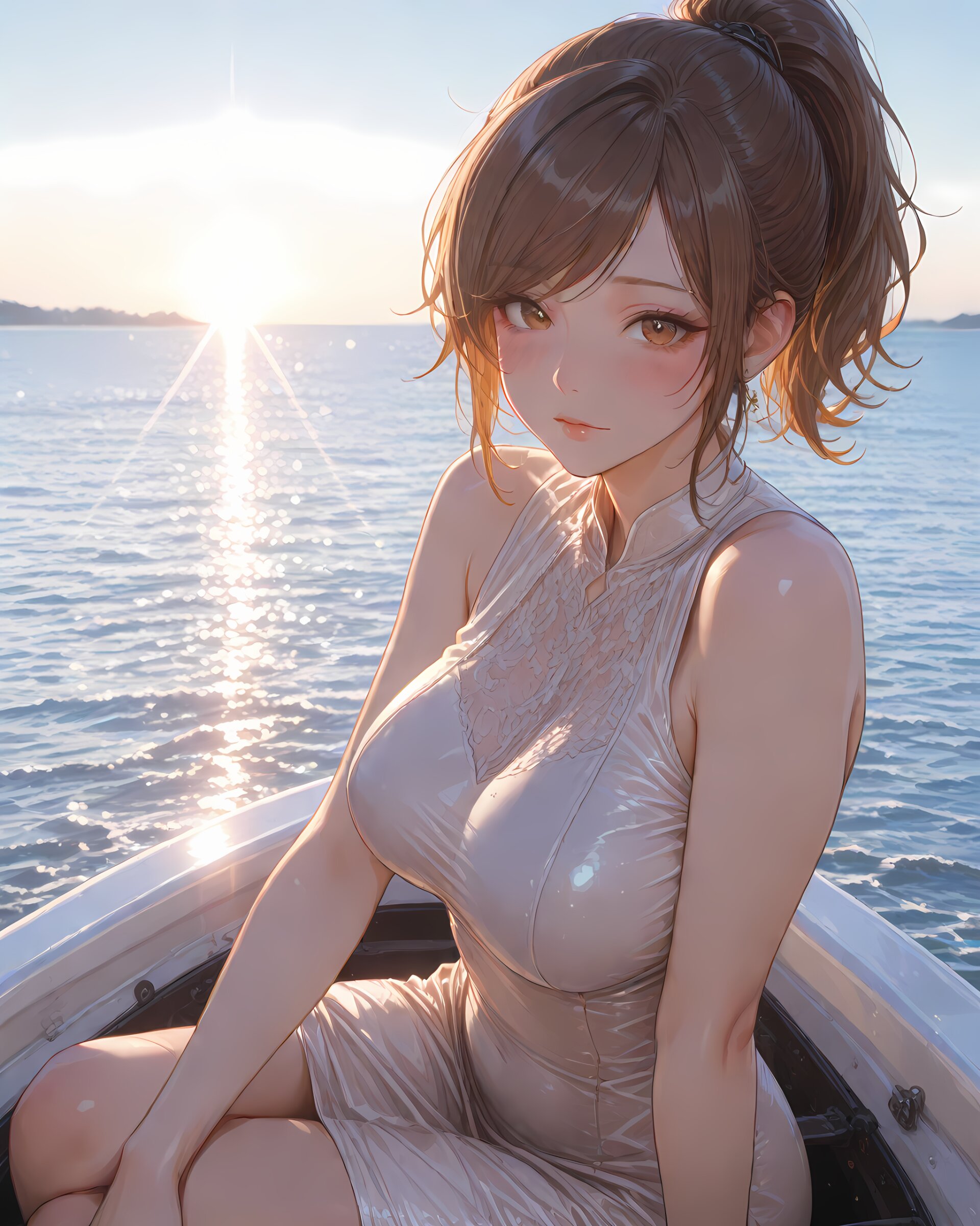 <lora:hyper_sdxl_8_step_lora_f16:1>,, 1girl, sitting on boat, sea, sexy pose, day, sun flare, vibrant colors, close-up, focus on face, BREAK beautiful lady, Married woman, 30 years old, (brown hair), swept bangs, high ponytail, large breasts, sleeve less dress, vulgarity, blush, BREAK masterpiece, amazing quality, best quality, ultra-detailed, 8K, dramatic lighting,