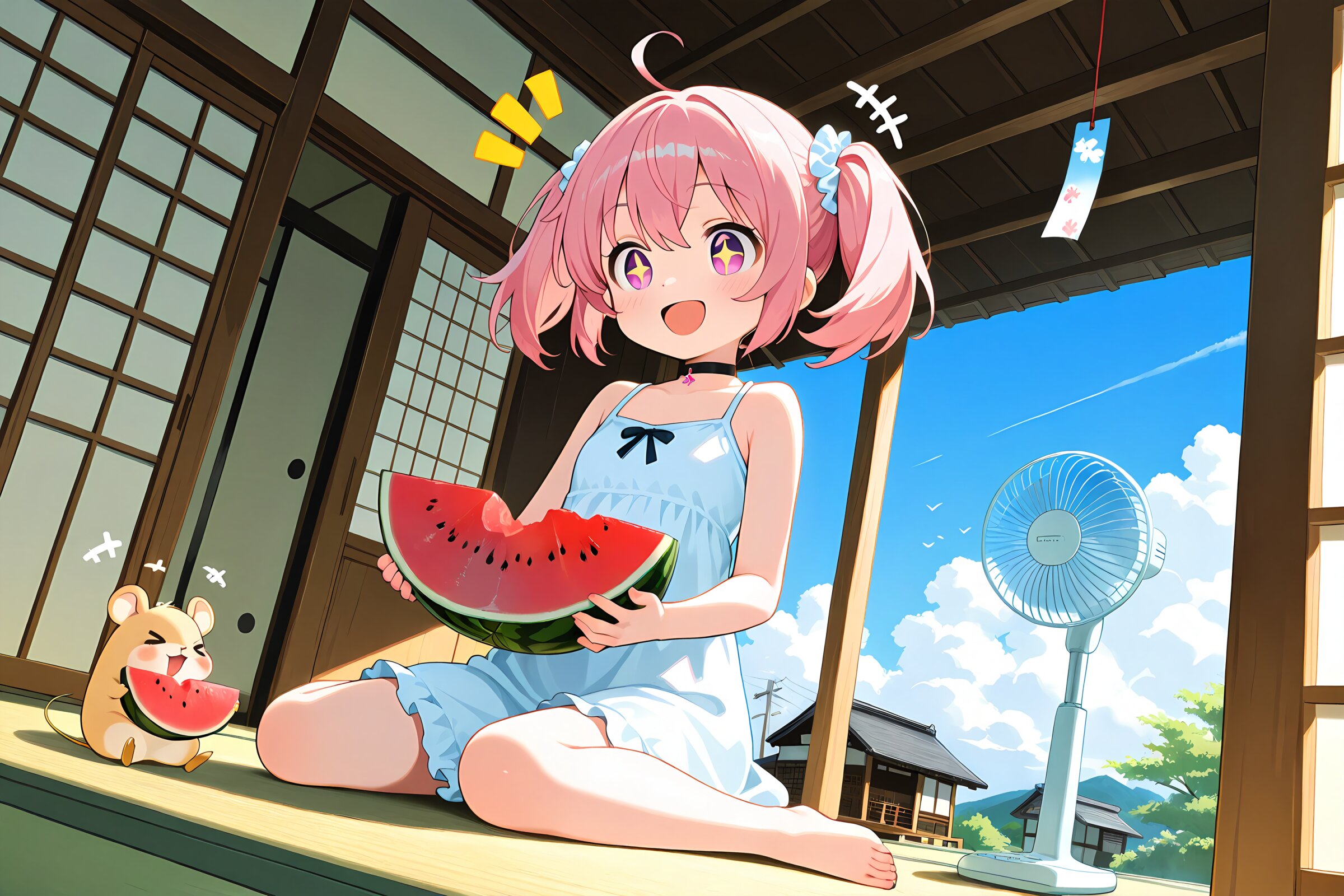 1 little girl, solo, diagonal angle, masterpiece, best quality, amazing quality, very aesthetic, pink hair, twintails, pink eyes, +_+, open mouth, smile, cheerful, +++, notice lines, choker, summer outfit, wariza, holding watermelon, hamsters, > <, picture diary, electric fan, wind chimes, old japanese house, sunshine, japanese summer,