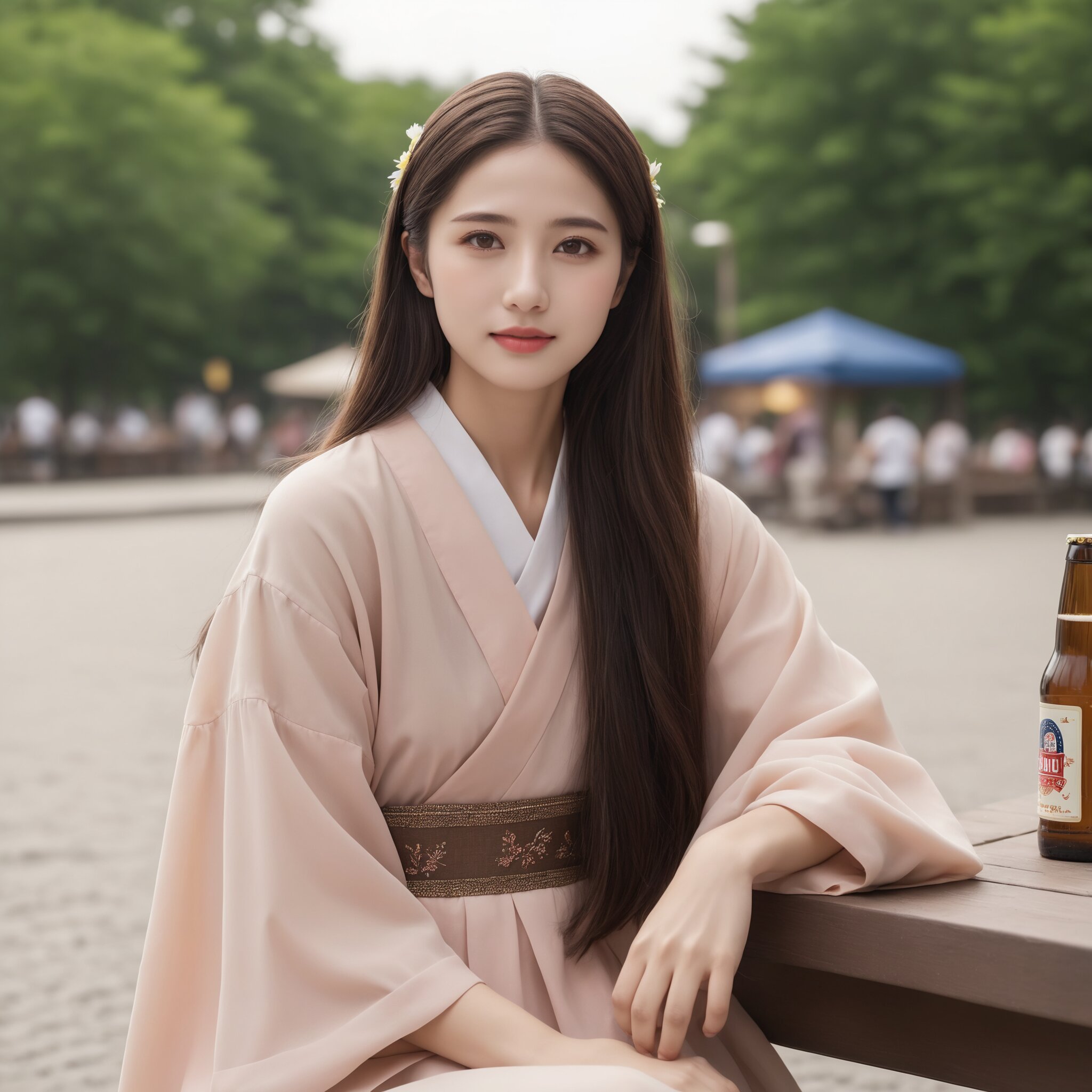 masterpiece,best quality,8k,raw photo,photo realistic,detailed skin,detailed face,extremely beautiful face,BREAK cowboy shot, 1 girl, Mature body, medium breast, detailed face, natural makeup, Glossy Lips, light pink eyeshadow, brown eyes, detailed mouth, (brown hair), (long braid hair), (glasses), (beautiful yellow kimono:1.2), Chrysanthemum Embroidery, beautiful obi, nishikiori, soft smile, blush, look at viewer, (holding a beer mugs:1.3), sitting on bench, (Many empty beer bottles scattered on the ground:1.5), outdoor, summer festival, Street vendors, Lanterns, flags, (night time), moon lighting,