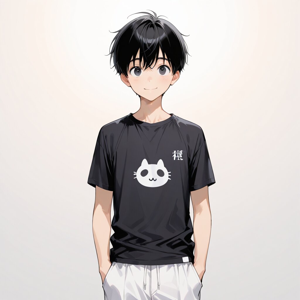 boy, short hair, Black hair, Black eyes, Black shirt, little smile, expression eyes, beautiful eyes, 8K resolution, ultra detailed, solo, cowboy shot