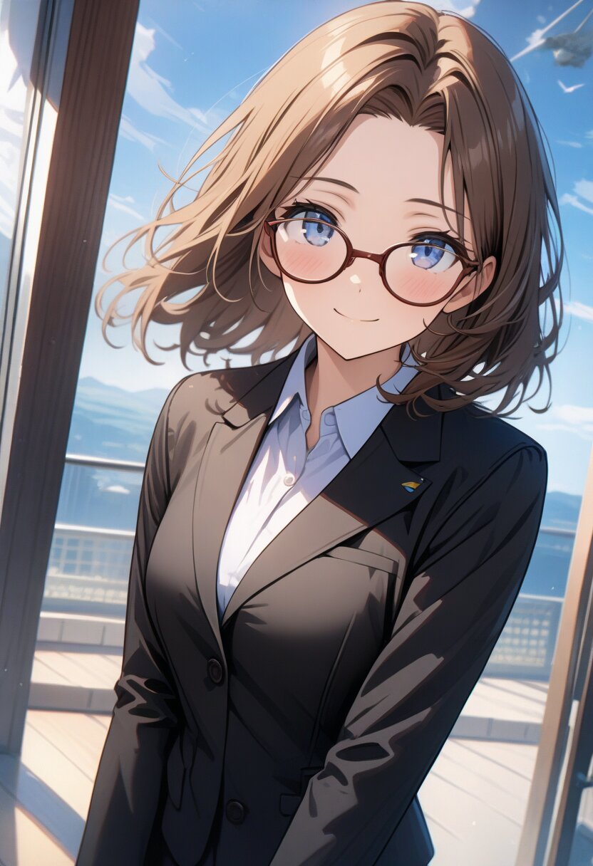 8K resolution, ultra detailed, expression eyes, beautiful eyes, adult, woman, medium hair, brown hair, forehead, glasses, business suits, Smile, Blue sky, solo, cowboy shot,