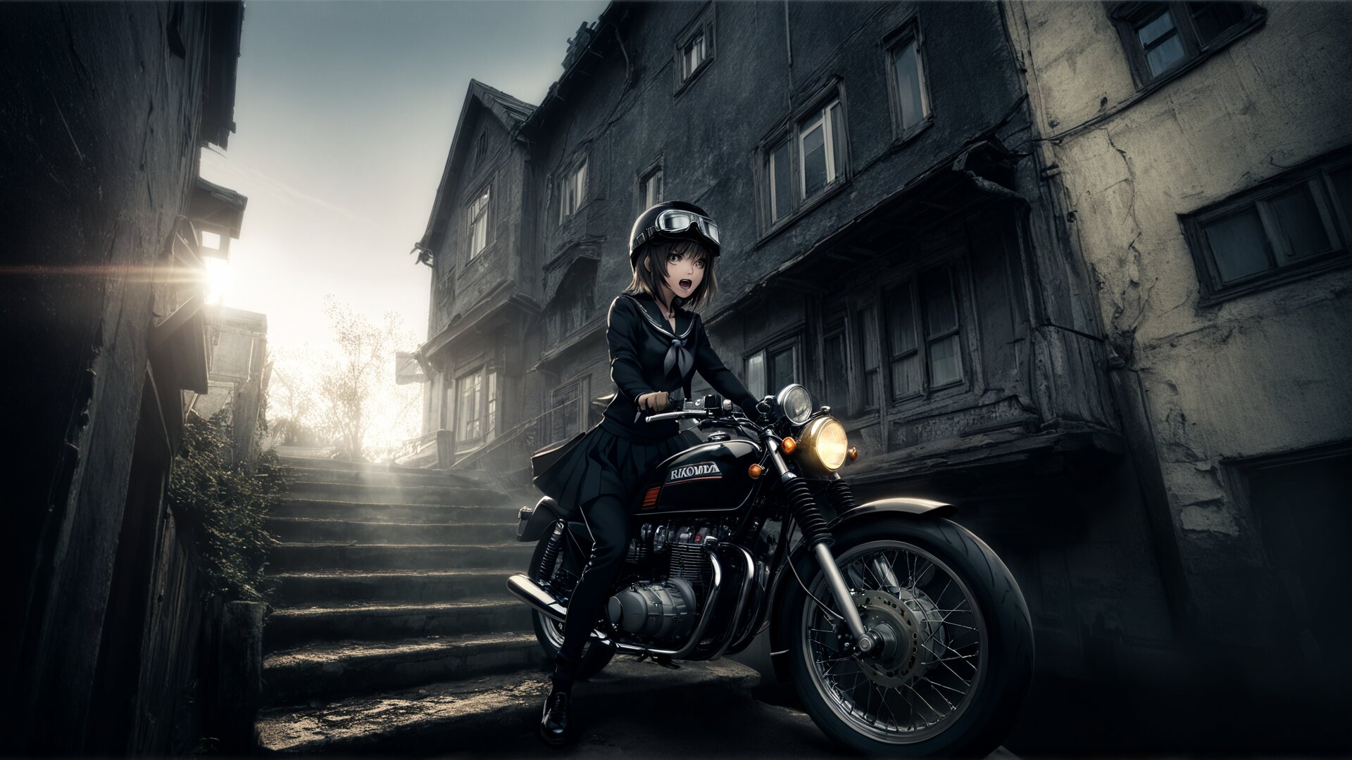 1girl, slender girl, black serafuku, bangs, long sleeves, very long hime cut, sidelocks, (side line track pants:1.2100000000000002), (pants under skirt:1.2100000000000002), streaked straight hair, black loafer, leaning forward, bent over, cluttered background, sit astride, straddling, steam, from below, dynamic angle, strong light, star night, steampunk, GB65 motorcycle, honda cb350, black large motorcycle, cafe racer, gray neckerchief, looking at viewer, skirt, sailor collar, pleated skirt, black skirt, hair flaps, black shirt, black sailor collar, high neck black undershirt, building, stairs, sign, house, tree, ground vehicle, watercraft, window, science fiction, white background, sky, motor vehicle, grey background, architecture, cable, air conditioner, goggles helmet, solo, upper body, open mouth, concept art <lora:CB_350_v1:0.65> <lora:BlackSerafukuPonyV1:0.69> <lora:BuildingConceptSheet:0.7> <lora:goggles_helmet_v1:1> <lora:dark:0.66>
