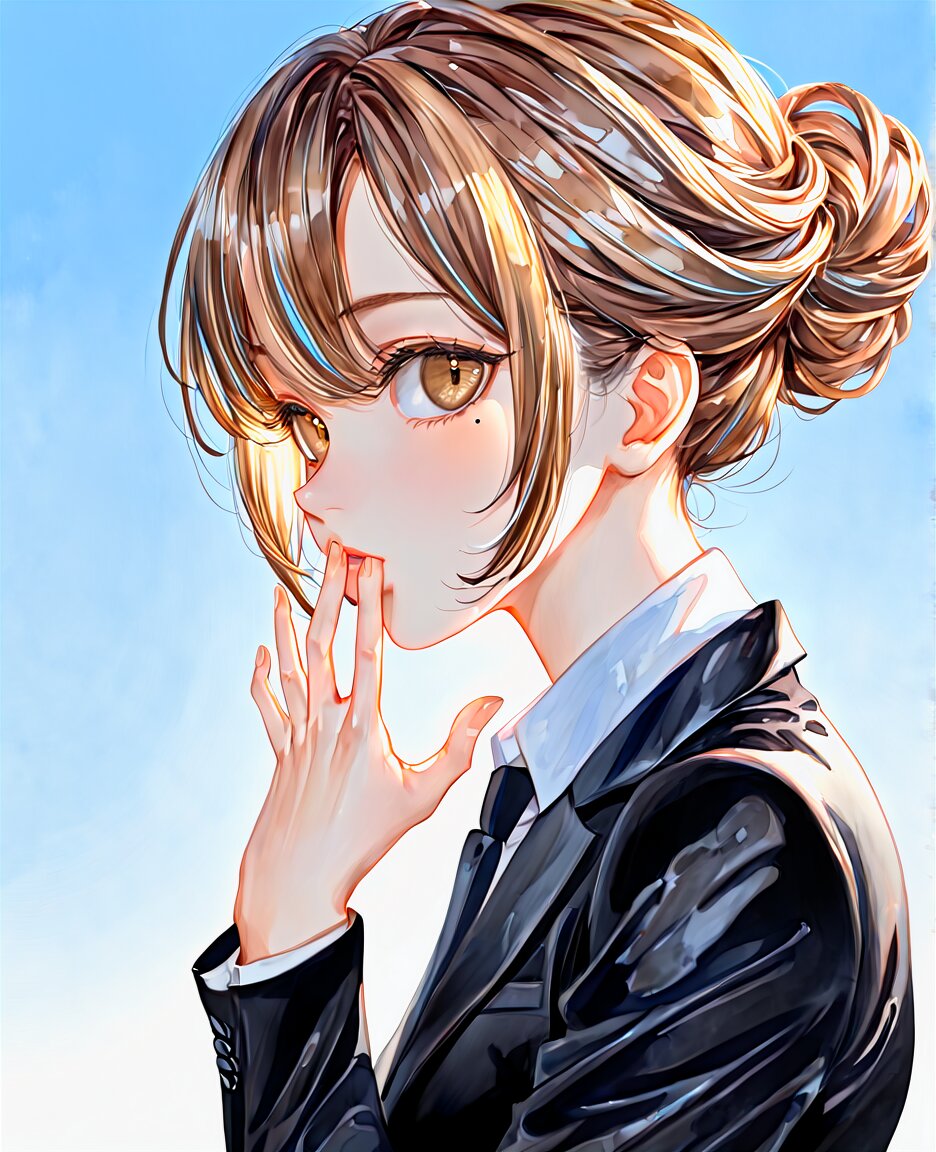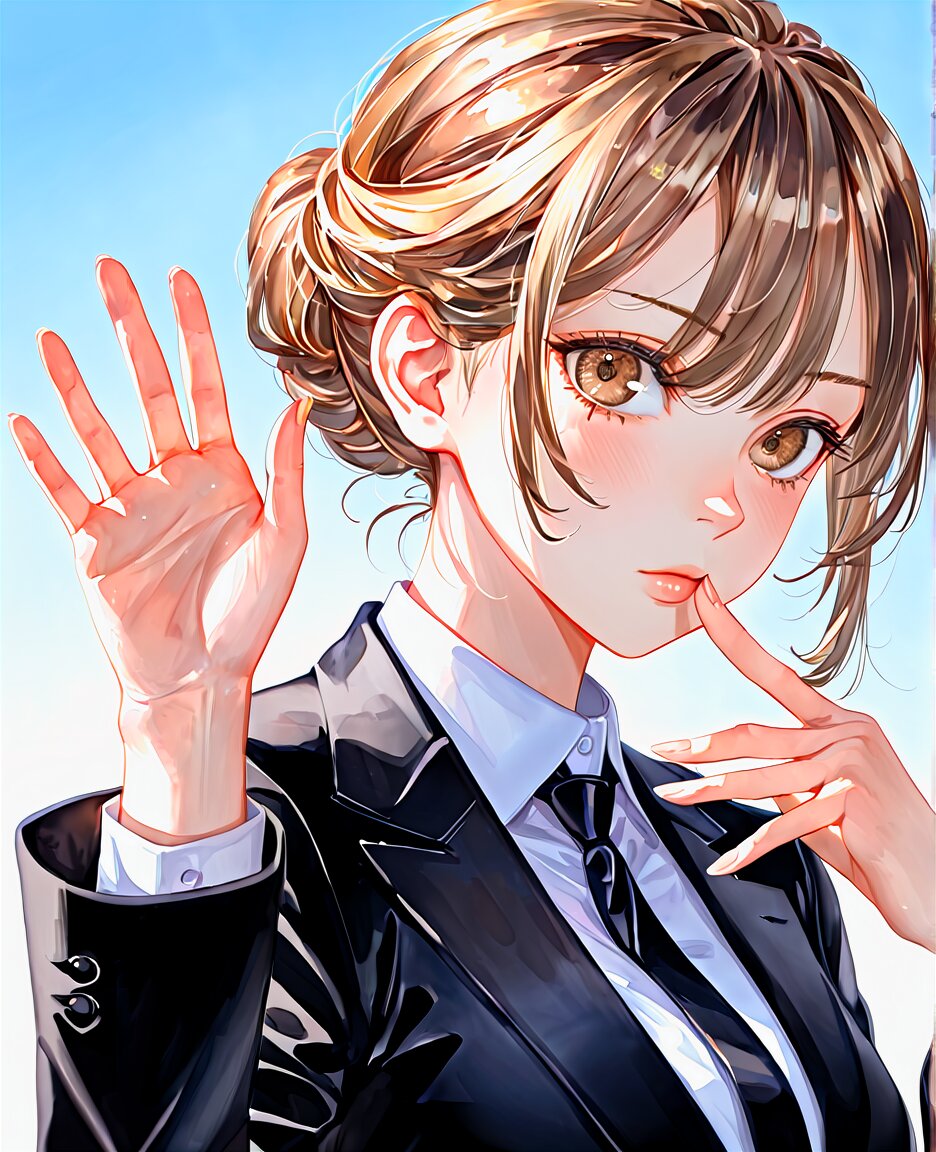 paefect anatomy, 1girl, black suit, collared shit, light blue sky, watercolour, from behind, beauty detailed light brown eyes, mole under eye, detailed streaked glossy hair, updo, profile, <lora:DetailedEyes_V3:0.66> detailed eyes, <lora:DetailedPerfect_hands_r1:0.63> detailed hands, perfect hands, solo, fingernails, gradient, palms, outstretched hand, fingers,