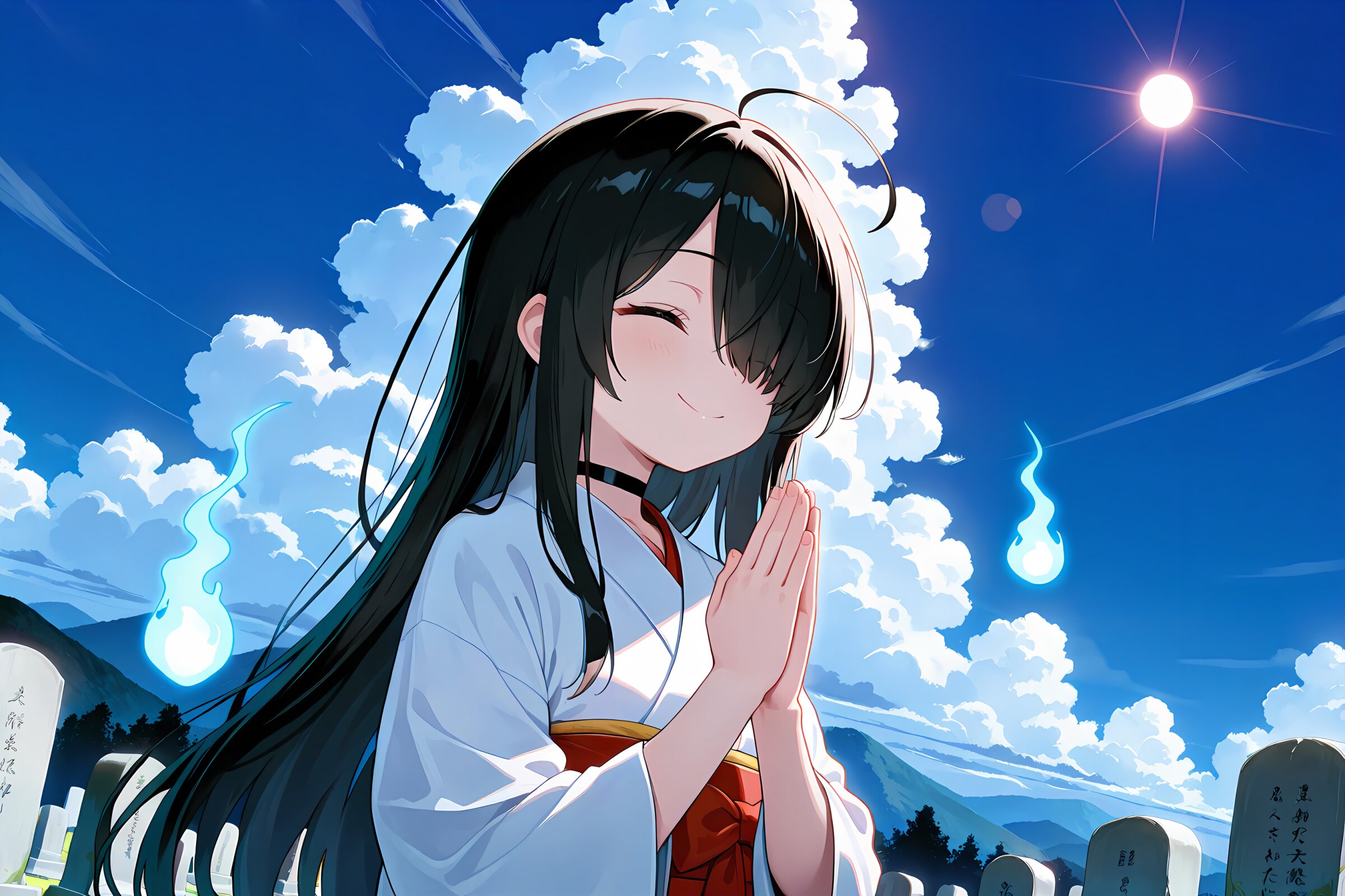 1 little girl, solo, diagonal angle, masterpiece, best quality, amazing quality, very aesthetic, black hair, long hair, ahoge, (hair over one eye:1.2), closed eyes, closed mouth, smile, cheerful, choker, white kimono, praying, palms together, hitodama, japanese graveyard, summer, sun, cumulonimbus cloud,