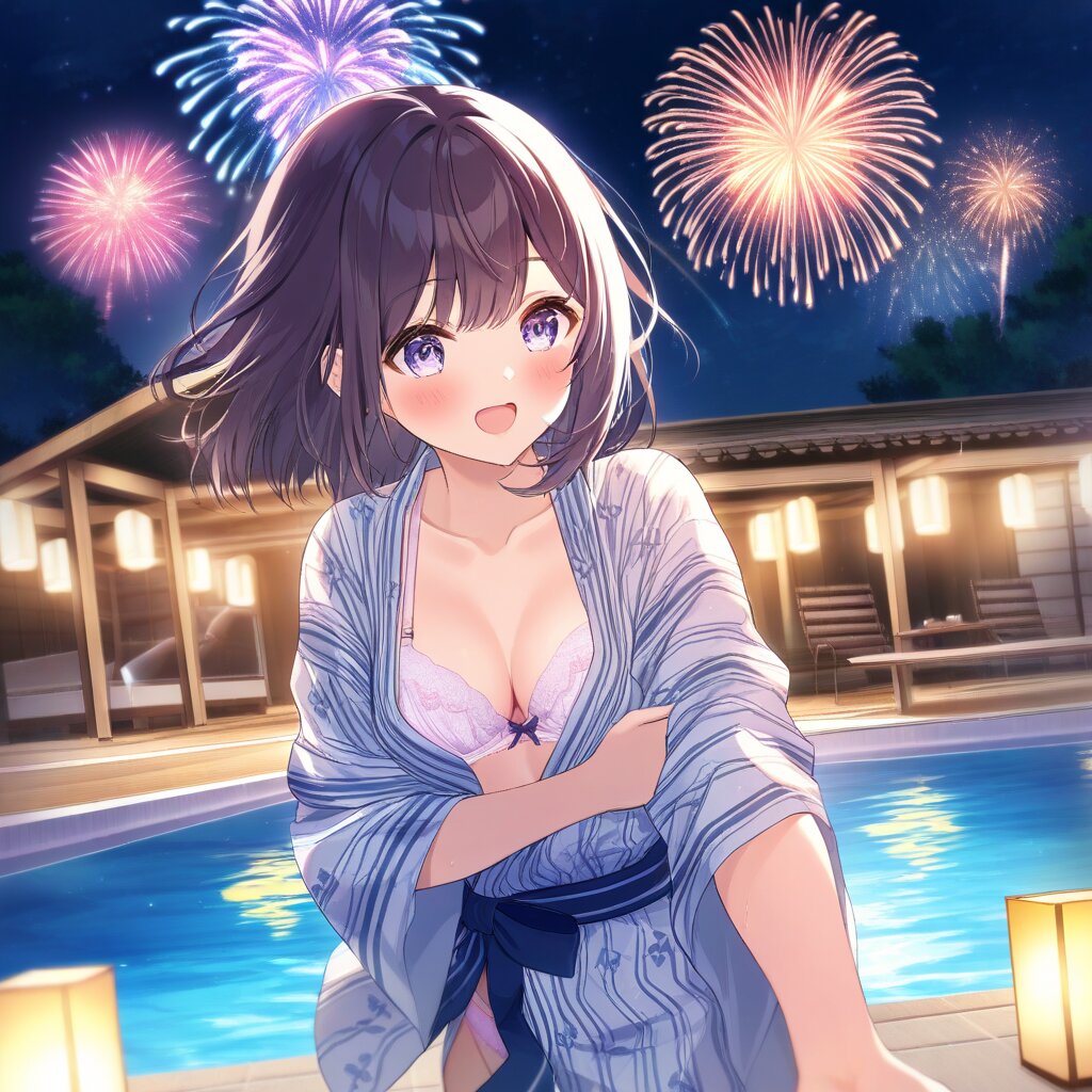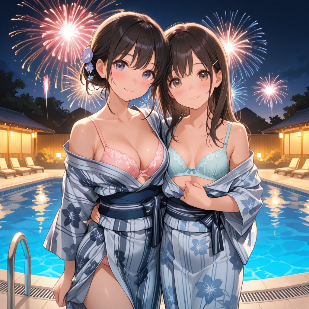 masterpiece, best quality, 2girls, kawaii, hugging, panty, hip, Open thin yukata, chest, bra, Taking off the yukata, underwear, good hand, fireworks, summer night, pool,