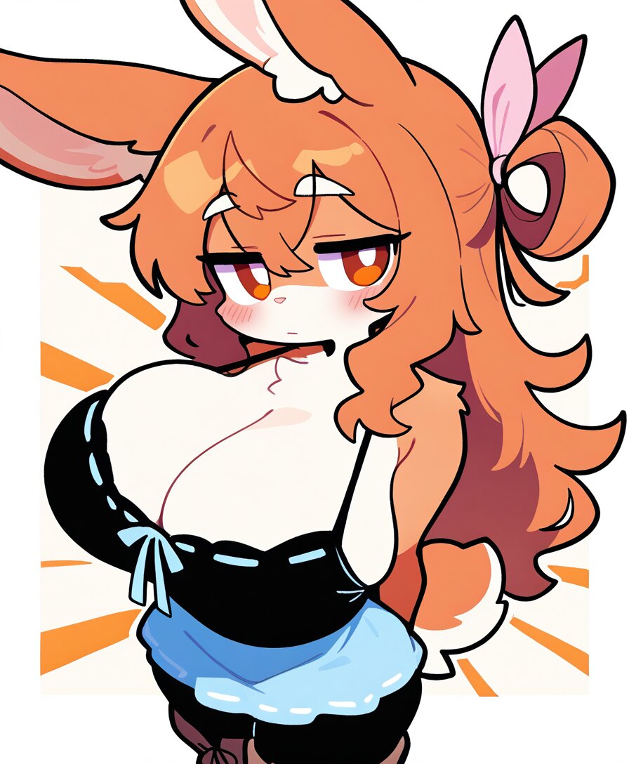 solo, short female, oppai loli, rabbit girl, furry female, orange fur, fluffy body fur, stand fur, orange rabbit ears, rabbit nose, orange rabbit tail, huge breasts, slim, thick thighs, wide hips, orange hair, long hair, hair rings, pink ribbons, hair between eyes, orange eyes, jitome, no pupils, expressionless, unemotional, closed mouth, layering, cleavage, sleeveless, black camisole, ribbon-trimmed camisole, blue chiffon skirt, black pantyhose under the skirt, wide A-line, brown thigh boots, boots over pantyhose, standing, arms behind back, sunburst background, white border, head tilt, looking to the side, from front, sideways glance, from side, cowboy shot, foreshortening, perspective, saturated, smooth, dramatic angle, looking at viewer, simple background, low contrast:1.2, softy, 2D, stylized, kawaii, cute, anime coloring, furry, two tone fur, furry body, perfect body, detailed face, visible wide hips, high quality, cute clothes, animal tail, animal ears, solo, voluminous thighs, masterpiece, seductive mischievous expression, eductive demeanor, correct_anatomy, flat color style, simple coloring style, no lines, simple style, vibrant colors, good light, paint style, black pantyhose, detailed_hands:1.5, lolitaaa, girl, small body, short girl, petite, very short, tiny, cute