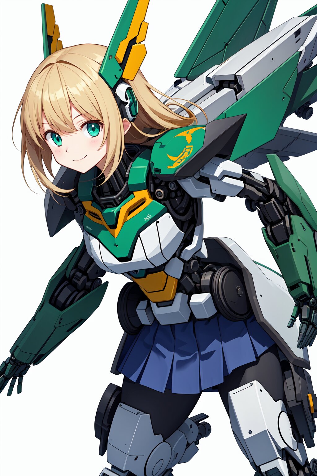 1girl, ((white background)), ultra detailed 8k cg render, masterpiece, high resolution, extremely detailed, mechanical shoulder, mechanical leg, headgear, mecha armor, ((mecha skirt)), mechanical wing,long blonde hair, dropping green eyes, smile, dynamic angle,