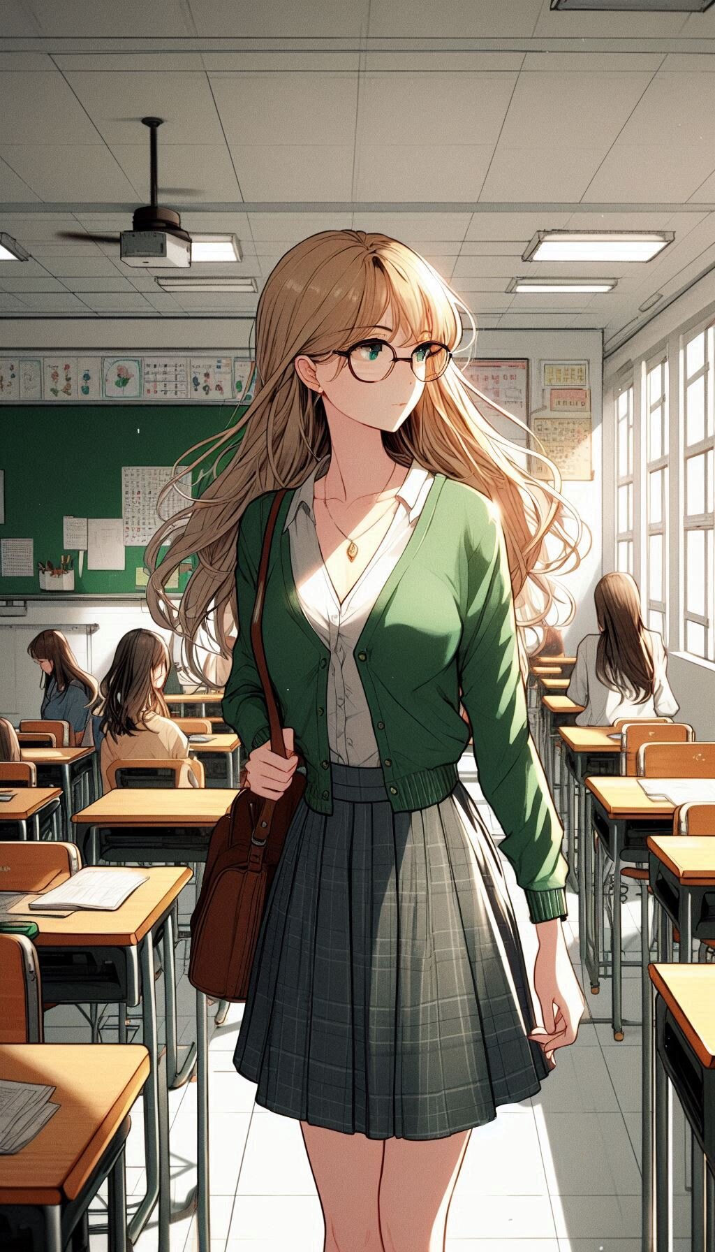 1 lady, long hair, blonde hair, glasses,green cardigan, long skirt, classroom, ,walking, looking away