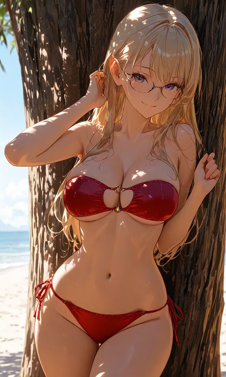 (best quality),(masterpiece),(ultra detailed),1 lady, long hair, blonde hair, smile, glasses, red bikini, ((bandeau bikini)), , big breasts, cowboy shot, (leaning against tree), night