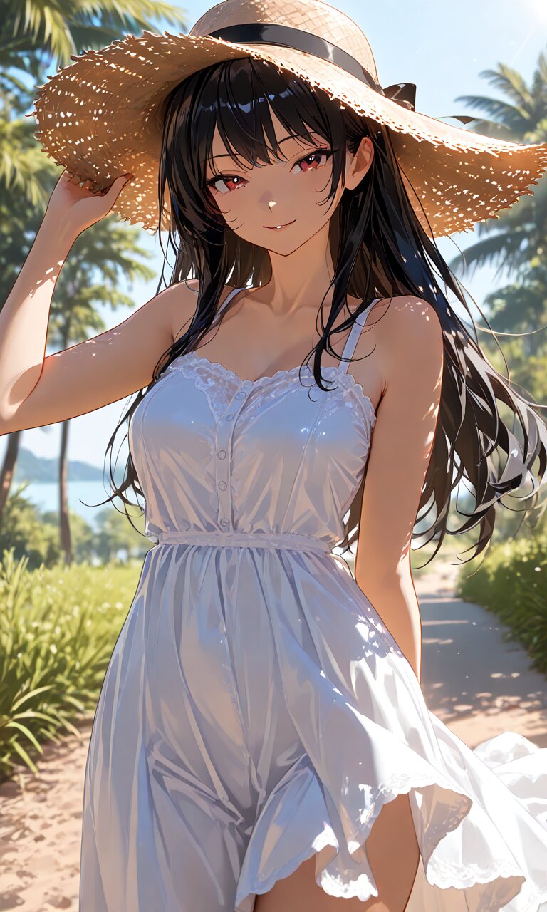1 girl, seductive smile, red eyes, long hair, black hair, white sundress, straw hat, cowboy shot