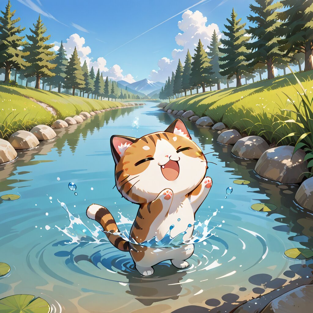 chibi, 1cat, playing in shallow river, blue sky, splash, relax, open mouth, no human:1.6