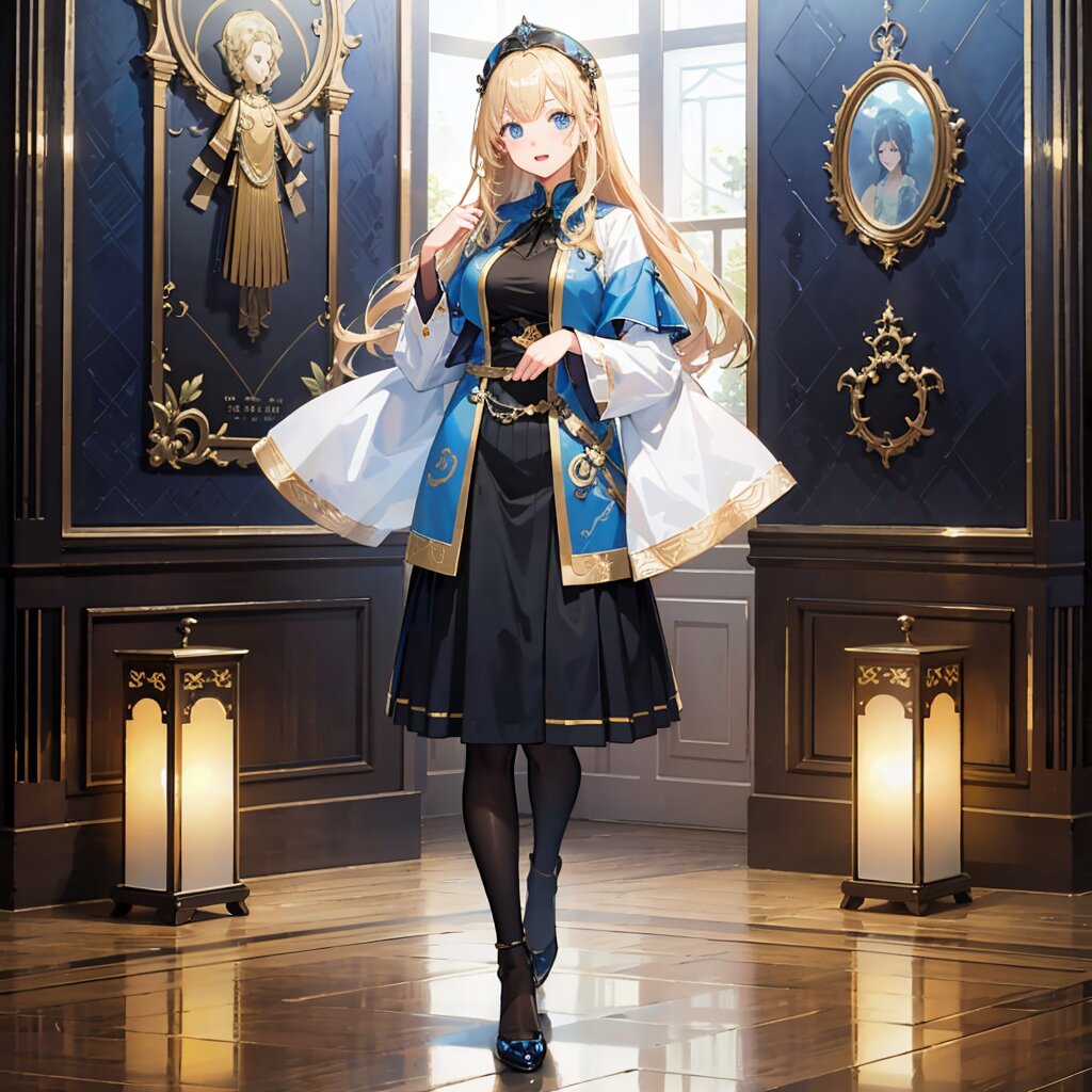 (masterpiece,high resolusion,illustration,ultra detailed 8k art,extremely detailed CG,official art,clothes reflecting light,detailed shiny skin,detailed background:1.3), ((highly detailed beautiful face and eyes)),1girl,beautiful blonde hair,beautiful blue eyes,open mouth,looking at viewer,idol costume,(fullbody shot:1.4), ロング髪 darkブラウン髪 オレンジ色目 美乳 室内 昼間 ブレザー チェックスカート