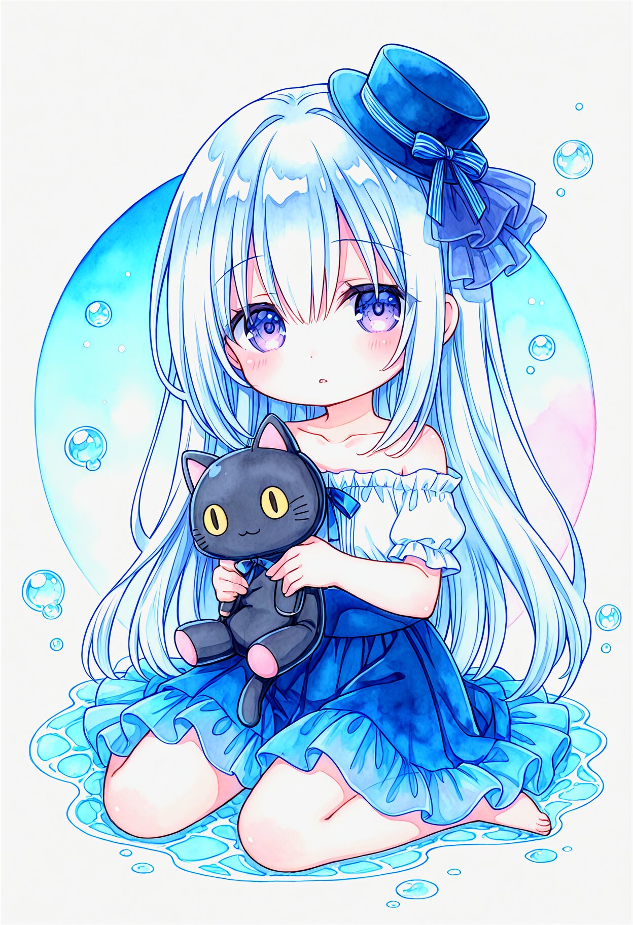 best quality, (pale color,:0.8) full body,portrait, pastel colors, (watercolor_pencil_\(medium\),:1.6) cat background, (chibi:1.4), (chibi girl:1.2), solo, (chibi), (chibi girl:1.2), collarbone, parted lips,(Expressionless:0.8), (half-closed eyes:0.8), pale purple eyes, tareme, (silver hair:1.1), (dark blue hair colored inner hair:0.8), long hair,very long hair, eyebrows visible through hair, white off-shoulder and dark blue skirt, one mini hat,strapping ribbon, see-through veil, (black cat stuffed toy,:1.2) holding, water, wariza, looking at viewer, bubble, upside down, <lora:sdxl2-flat2-512b:-1.5> <lora:noline-16oa:-1.0> <lora:pale color_paru:-1.3>