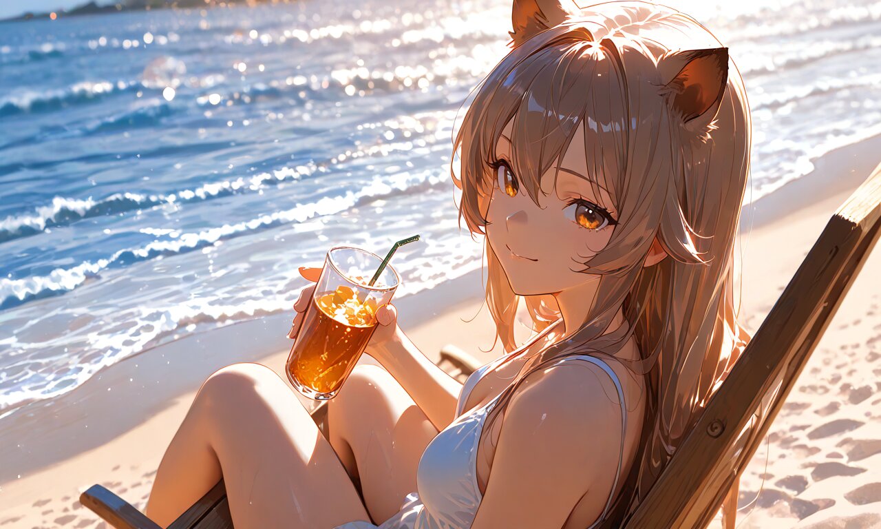 (best quality),(masterpiece),(ultra detailed)1 girl, light brown hair, long hair, amber eyes, wild boar's ears, sitting on deckchair, beach, drinking juice, smile, side view, looking at viewer,