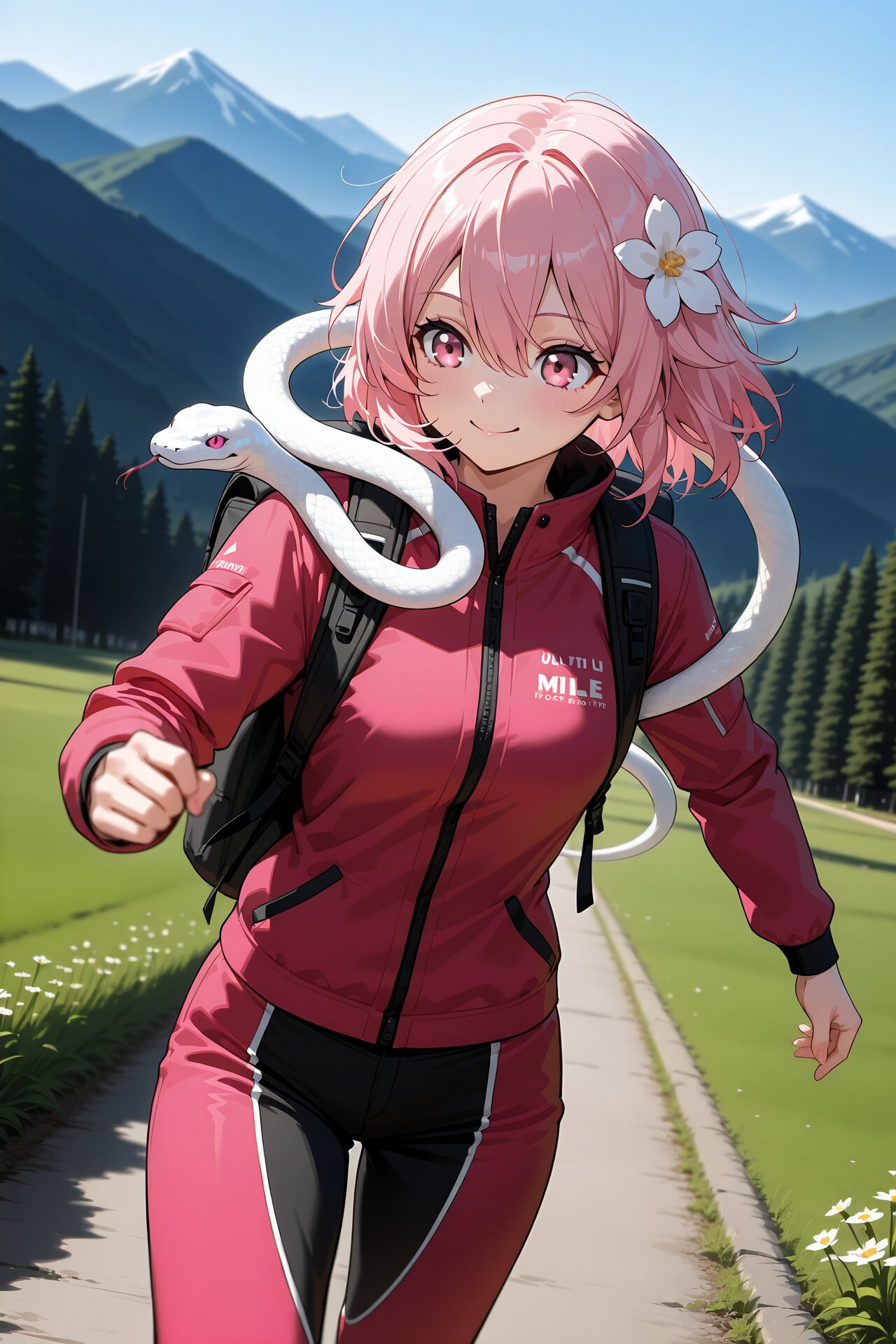 cowboy shot, masterpiece,best quality,ultra detail,intricate detail,absolutely resolution,8k, newest,digital-cel, photo background, blurry, blurry background, blurry foreground, depth of field, blurred background, solo, dynamic angle, action pose, 1girl, Mountains, bangs, flower, hair between eyes, hair flower, hair ornament, pink hair, light pink eyes, , hiking suit, walking, , 1white snake on shoulder, smile, happy, ,