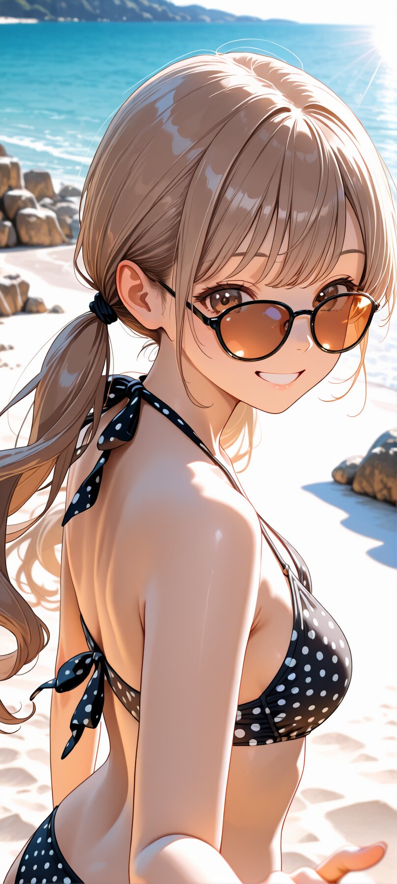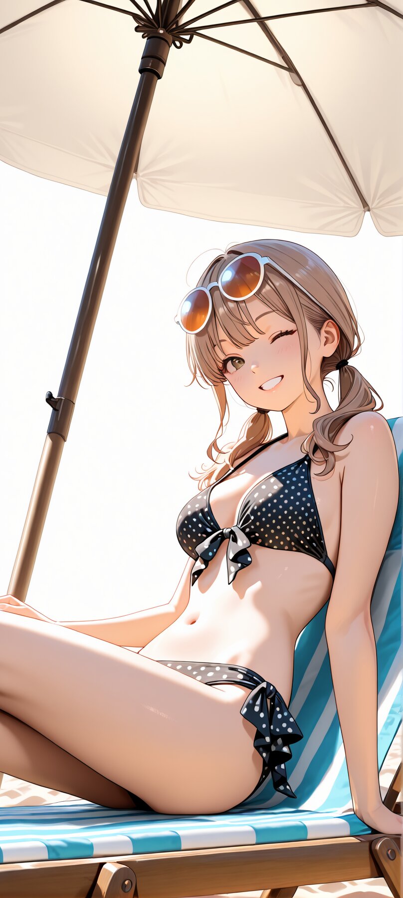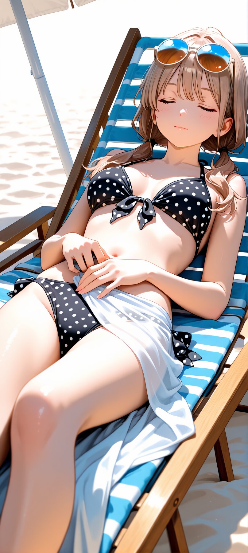 soft natural lighting,serene expression,photorealistic texture,clean background,simple background,ivory background,full shot, Long wavy light brown hair,loose twin tails,soft curtain bangs,black polka dot bikini,sun glasses, BREAK beach chair,parasol,lying,beach bed,eyes_closed,