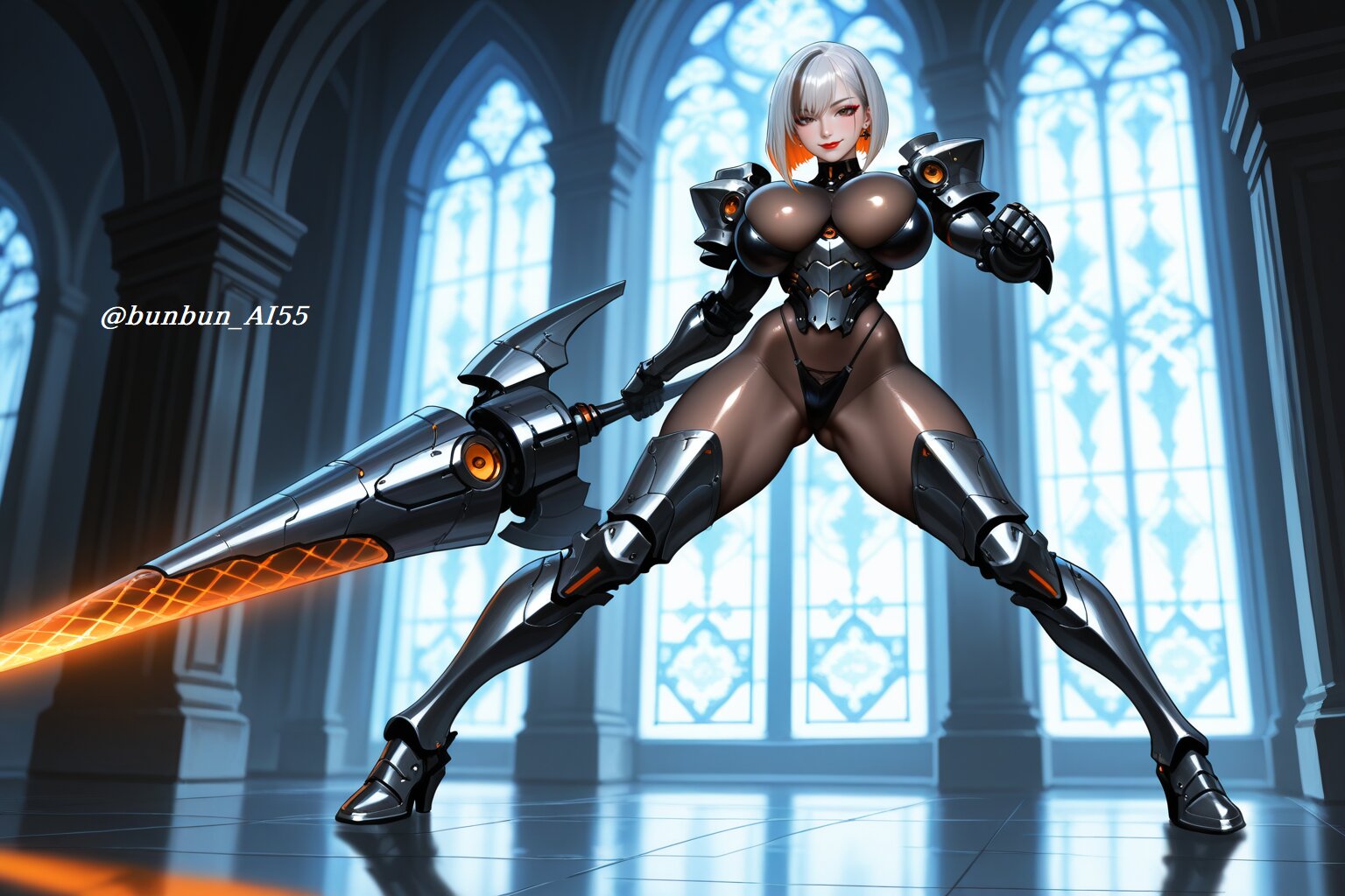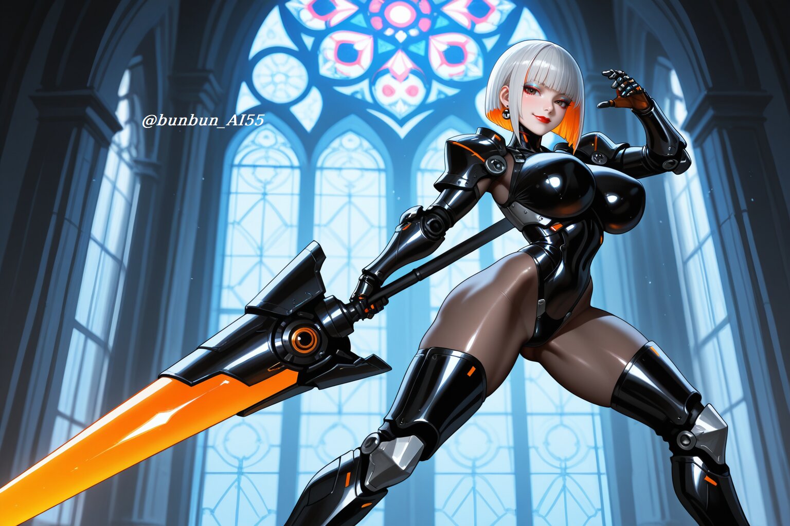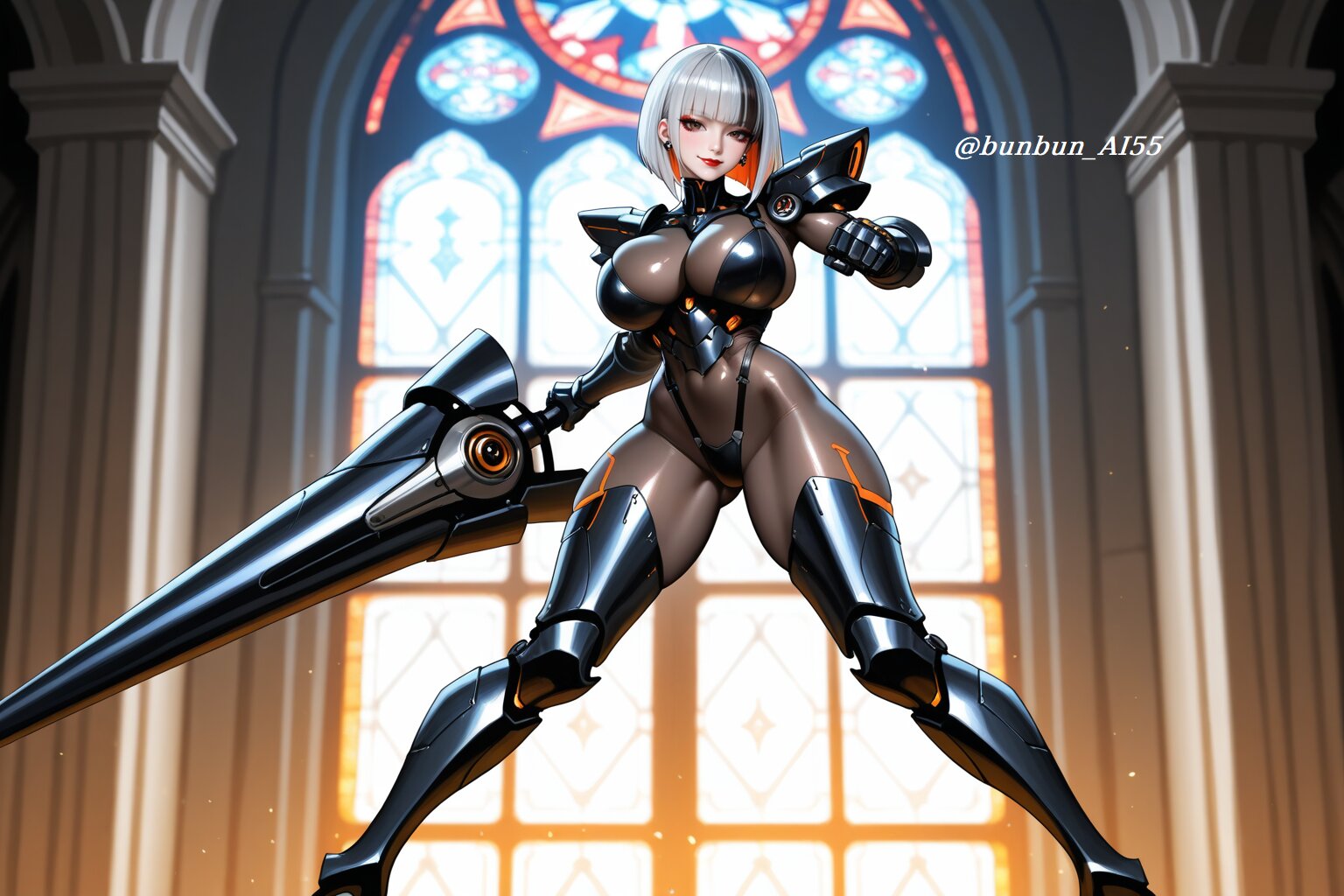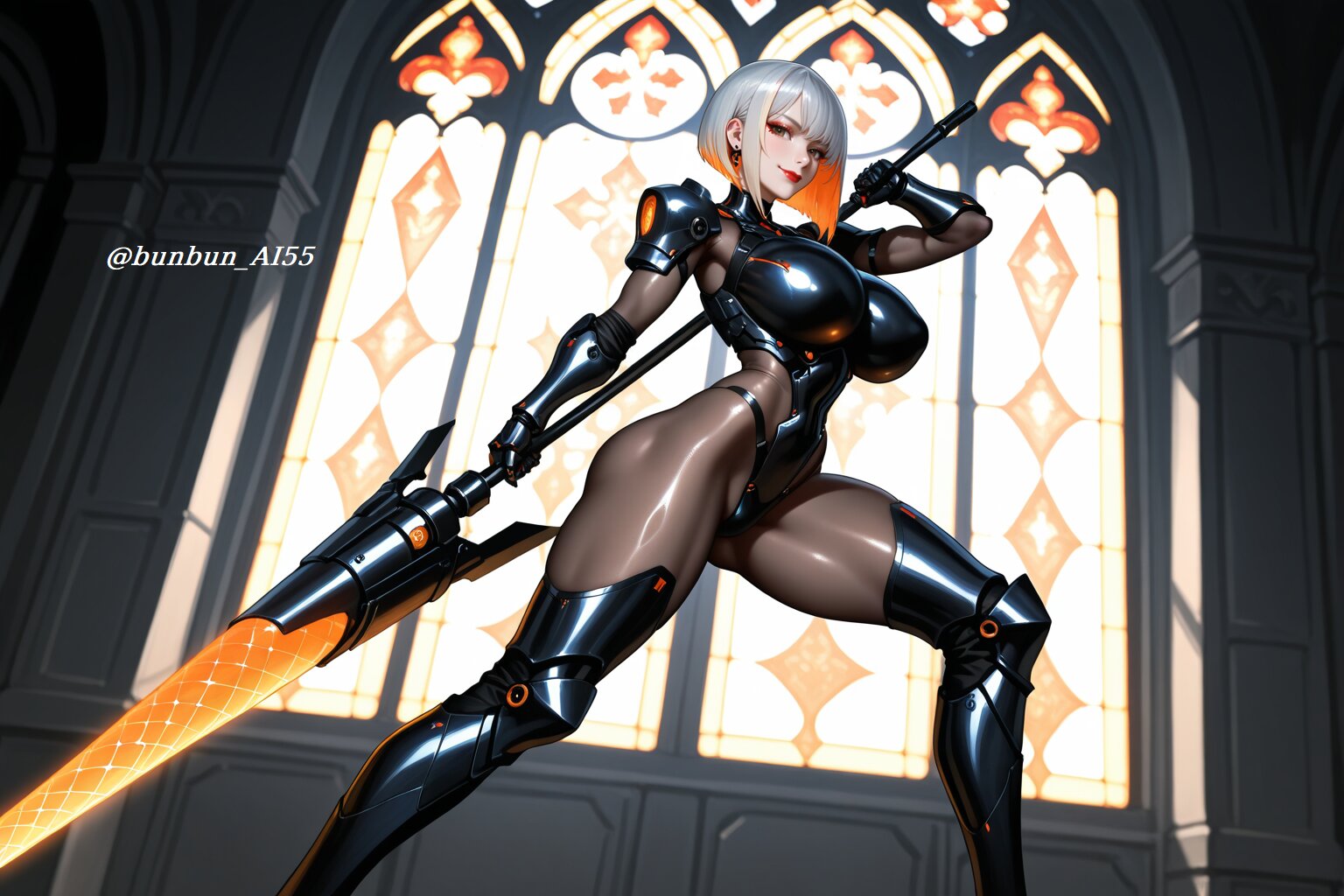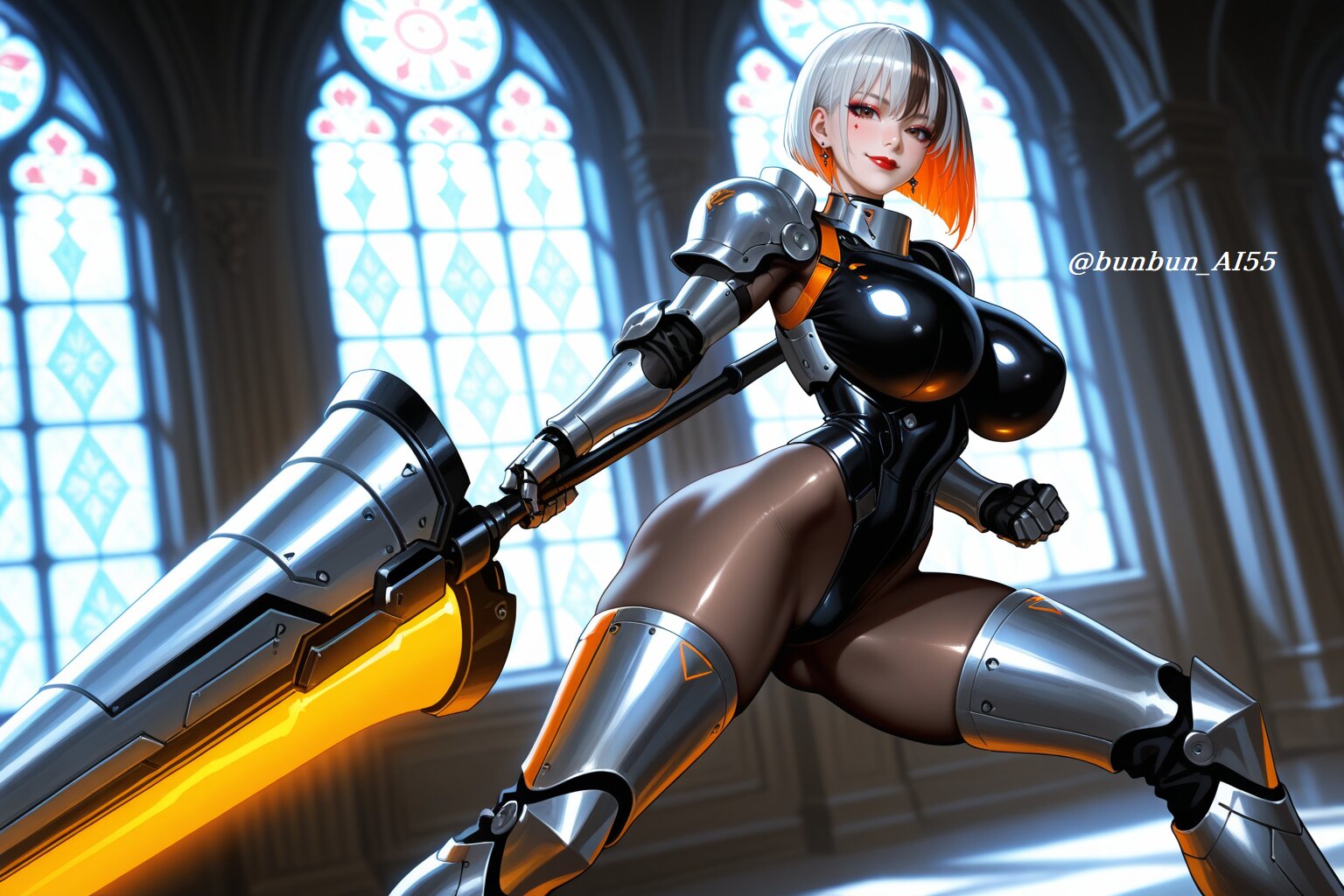 HDR, 8K,masterpiece, best quality, amazing quality, very awa, very aesthetic, absurdres, newest, detailed eyes, realistic eyes, realistic body, highres, add detail, sharp detailes, sharp lines, sharp focus, (realistic, hyperrealistic, photorealistic, realistic shading), sexy style, perfect anatomy, intricate details, high detail RAW color art, high contrast, digital painting, anime style, depth of field, (fantasy, mechanical, futuristic, cyberpunk), an intricate illustration, BREAK perfect lighting, professional lighting, face lighting, (1girl, elegant beautiful female knight:1.5, 22year old), (serious, sexy, model, cool beauty), (beautiful face, slim face, small face, cute face, detailed face, brown eyes, model makeup, red lips), (looking at viewer, alluring gaze, seductive smile), BREAK nsfw, (long bob cut, blcak hair, silver hair, two-tone hair:1.5), (jewelry, piercing, earrings), (huge breasts, pointy breasts), (long legs, thick thighs), (perfect hands), (shiny skin, glossy skin), (super model body:1.2, muscle body:1.2, slim body, athletic body:1.2), BREAK (wearing intricate sci-fi armor with complex decorations over sheer bodystocking:1.3, bodystocking, (body armor, waist armor, armored boots), black and orange color scheme:1.2, intricate design:1.2, metallic, glowing accents, carbon fiber texture), (mechanical gauntlets), (light reflections), (shiny, glossy, luster), (tight fit), BREAK (standing, legs apart, holding a white massive futuristic mechanical lance, dynamic pose, dynamic action pose, ready for battle pose, heroic pose, fighting pose:1.3), (detailed background, standing in front of a stained glass window inside a grand cathedral at night, dramatic lighting, cinematic atmosphere), (face focus shot:1.3, medium shot:1.2, dynamic angle),