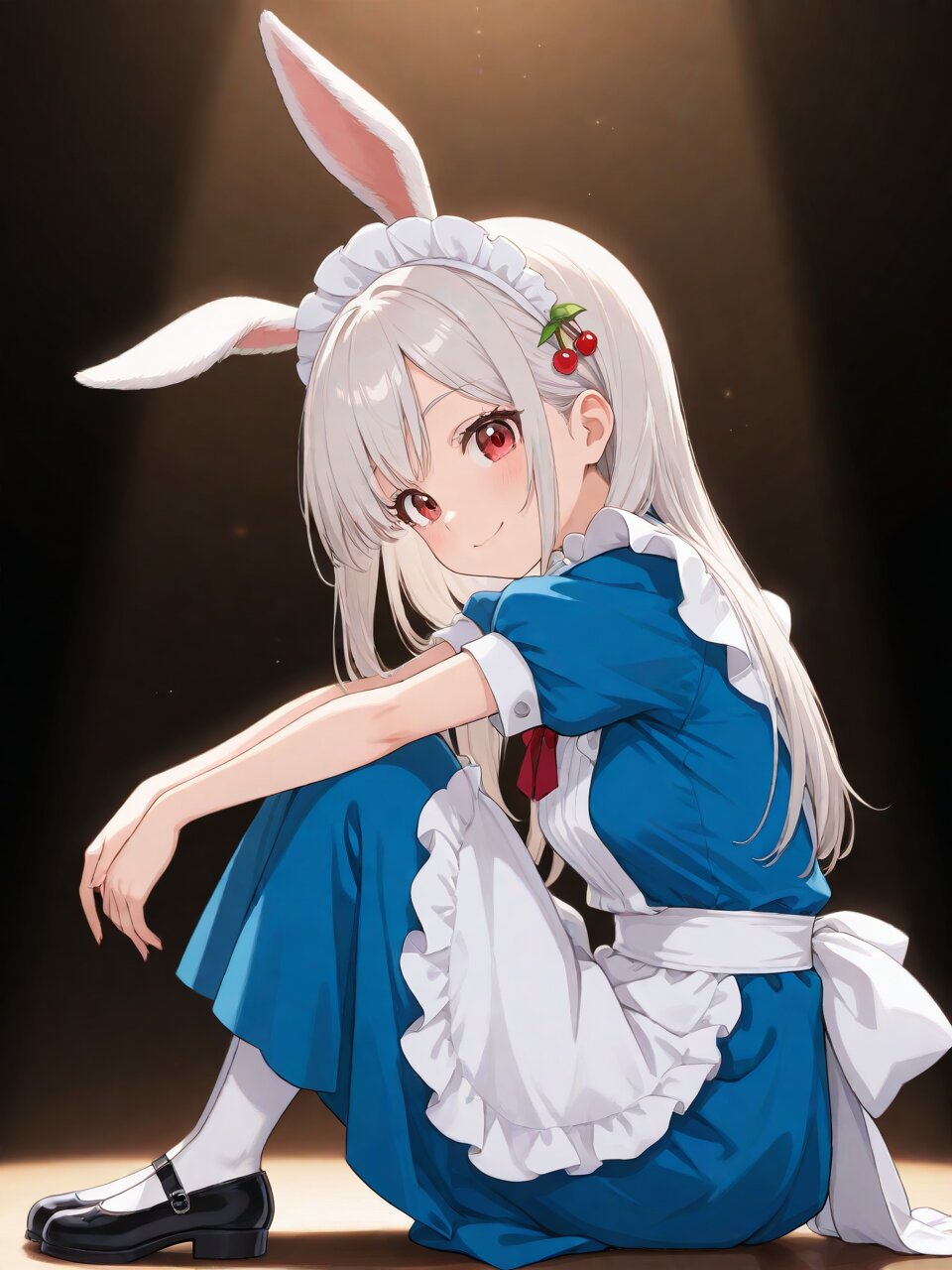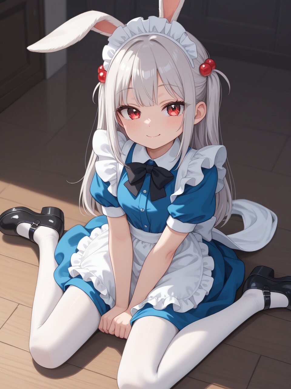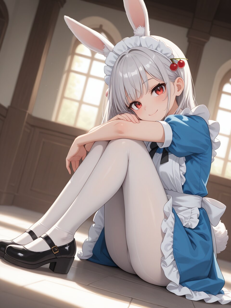(masterpiece, 32k,focus sharp,extreme detailed,top quality, best quality, beautiful and aesthetic:1.2), extremely detailed face, perfect lighting, 1girl,solo,24yo, (silver hair,cherry hair ornaments,pony tail,red eyes,sharp eyes,rabbit ears), smile,tilt head, alice \(alice in wonderland\), apron,bow,enmaided, blue dress, frilled apron, frills, maid, maid apron, maid headdress, waist apron,white apron, puffy short sleeves, puffy sleeves, mary janes,black footwear, white pantyhose, white legwear, sitting,wariza,from above