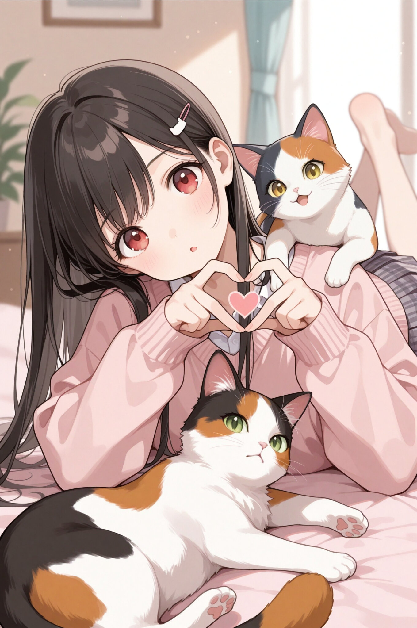 (flat color:0.1),(tareme:0.3),(playful cat, calico, yellow eyes, cat:1.2) , cute girl , lying, the pose , on stomach, red eyes, straight hair ,black hair ,(hair between eyes:0.5), hairpin, kawaii, (pastel theme :0.5), (depth of field:0.7), (bokeh:0.5),(:o:0.6), head tilt, BREAK cat on her back, hands up, heart hands, plaid skirt, pleated skirt, sleeves past wrists, sweater , (from side:0.3), blurry background