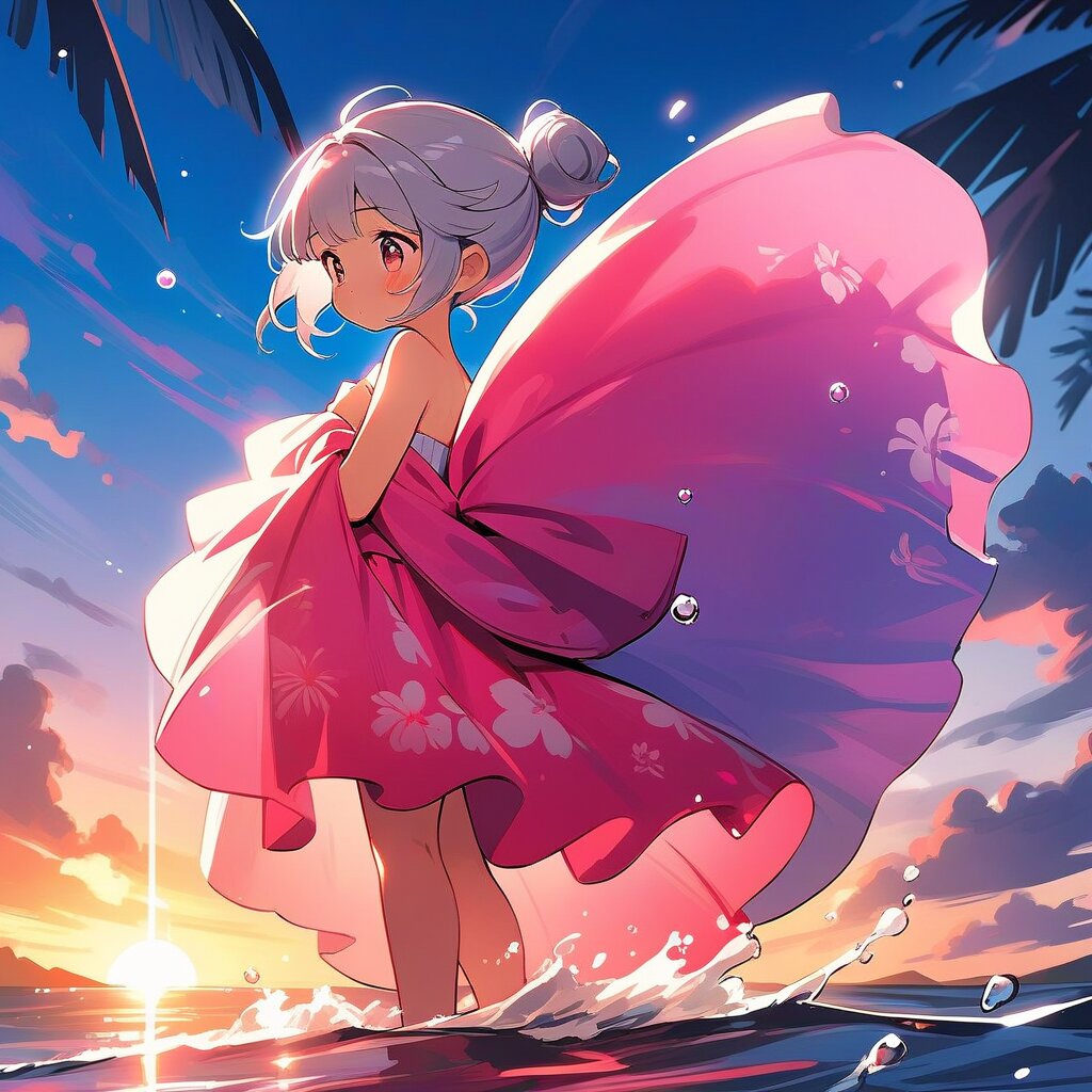 Highest quality, beautiful back view, action, dynamic composition, a beautiful, charming, and intelligent woman on a date at Waikiki Beach at sunset (silver hair in a two-sided updo, side bangs, shiny, sideburns, large, beautiful light red eyes (droopy eyes), pink lip gloss), full body, heart, gentle smile, blushing cheeks, muumuu (hibiscus pattern, light blue base), background is summertime Waikiki Beach (evening, sparkling sea), anime-like beautiful face, full body (no missing limbs, no extra limbs),