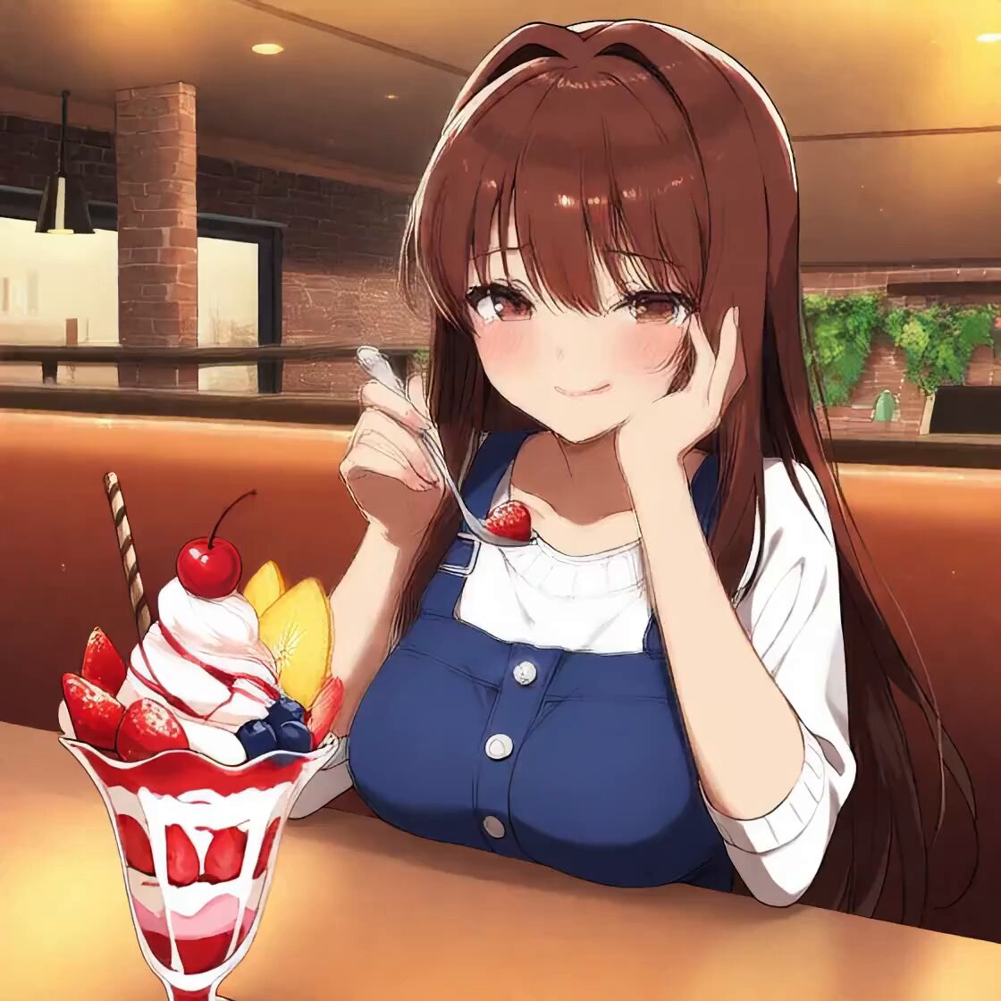 The girl is eating parfait. 少女はパフェを食べている。容器に入ったパフェが減っていく。 The girl eats parfait. The parfait in the container is reduced. 女孩小心翼翼地舀取着 parfait,勺子在容器中轻轻滑动。