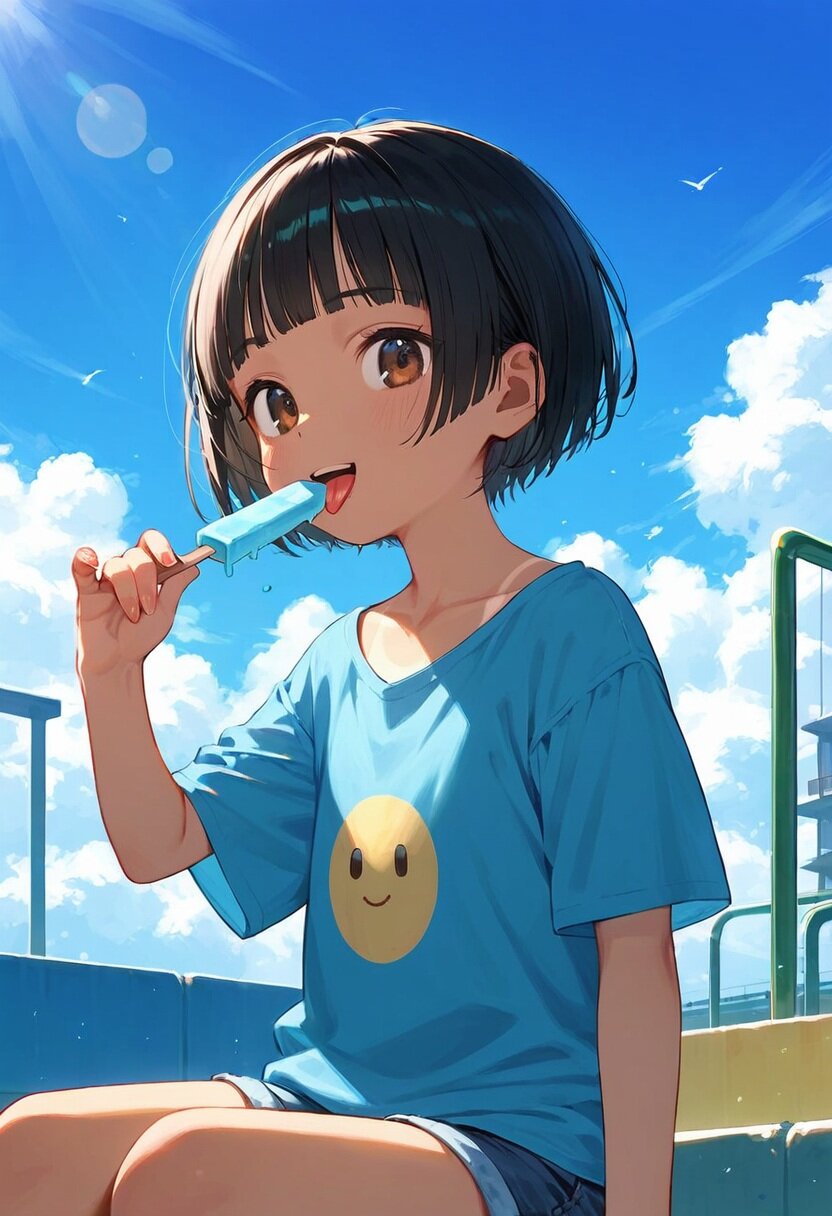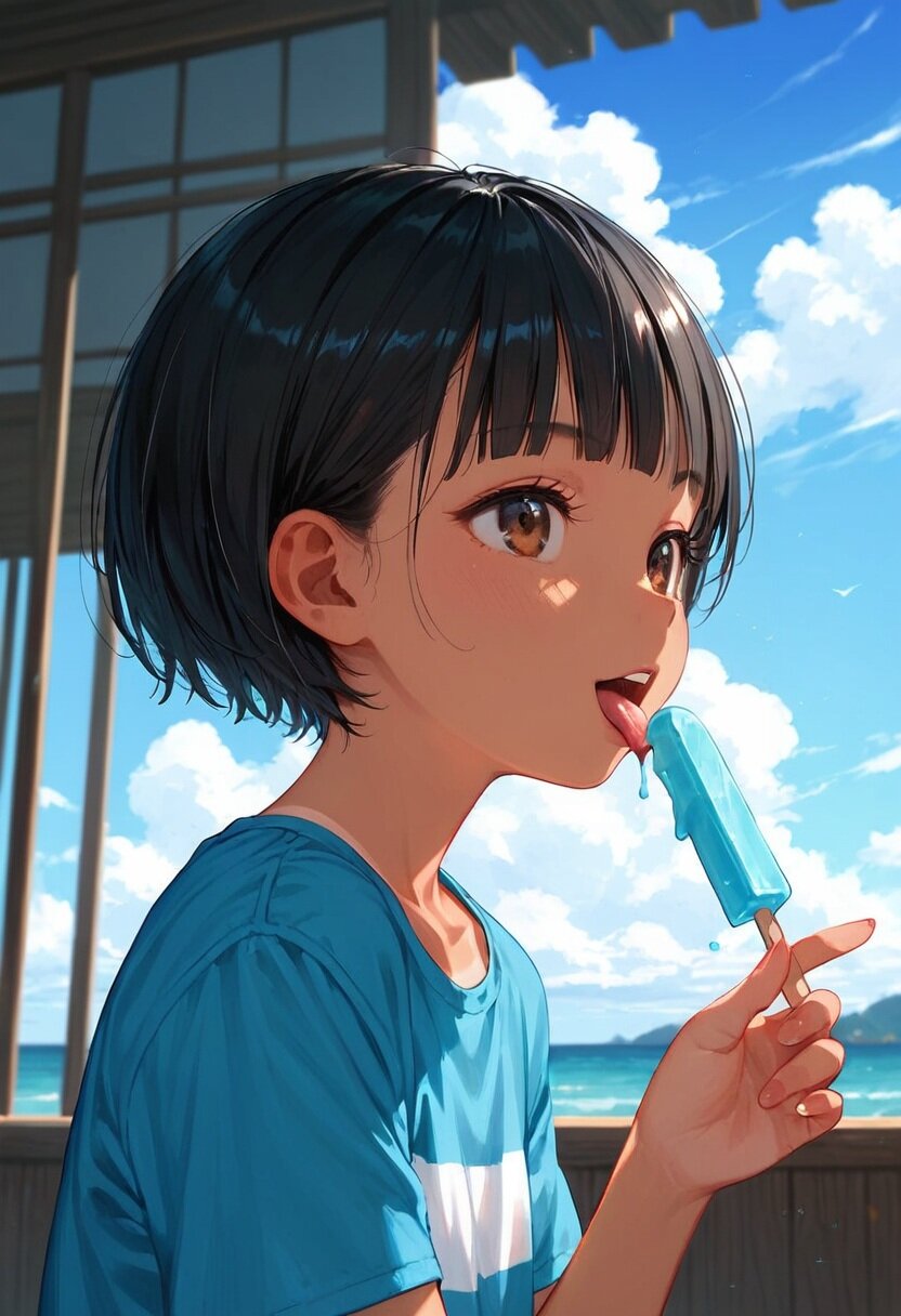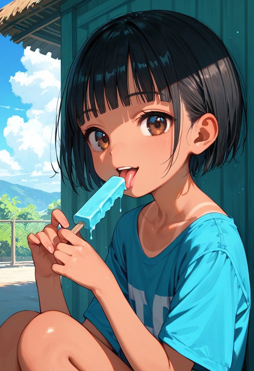 (score_9, score_8_up, score_7_up),detailed skin, rich contrast, outdoors, summer,sunny,solo focus, upper body, BREAK 1girl, (female child,cute, 11 yo),brown eyes, black hair, (bowl cut,very short hair,blunt bangs), thin legs,((one-piece tan:1.15)),happy,(eating blue popsicle),(tongue out:1.3), BREAK sky blue t-shirt, denim short shorts,