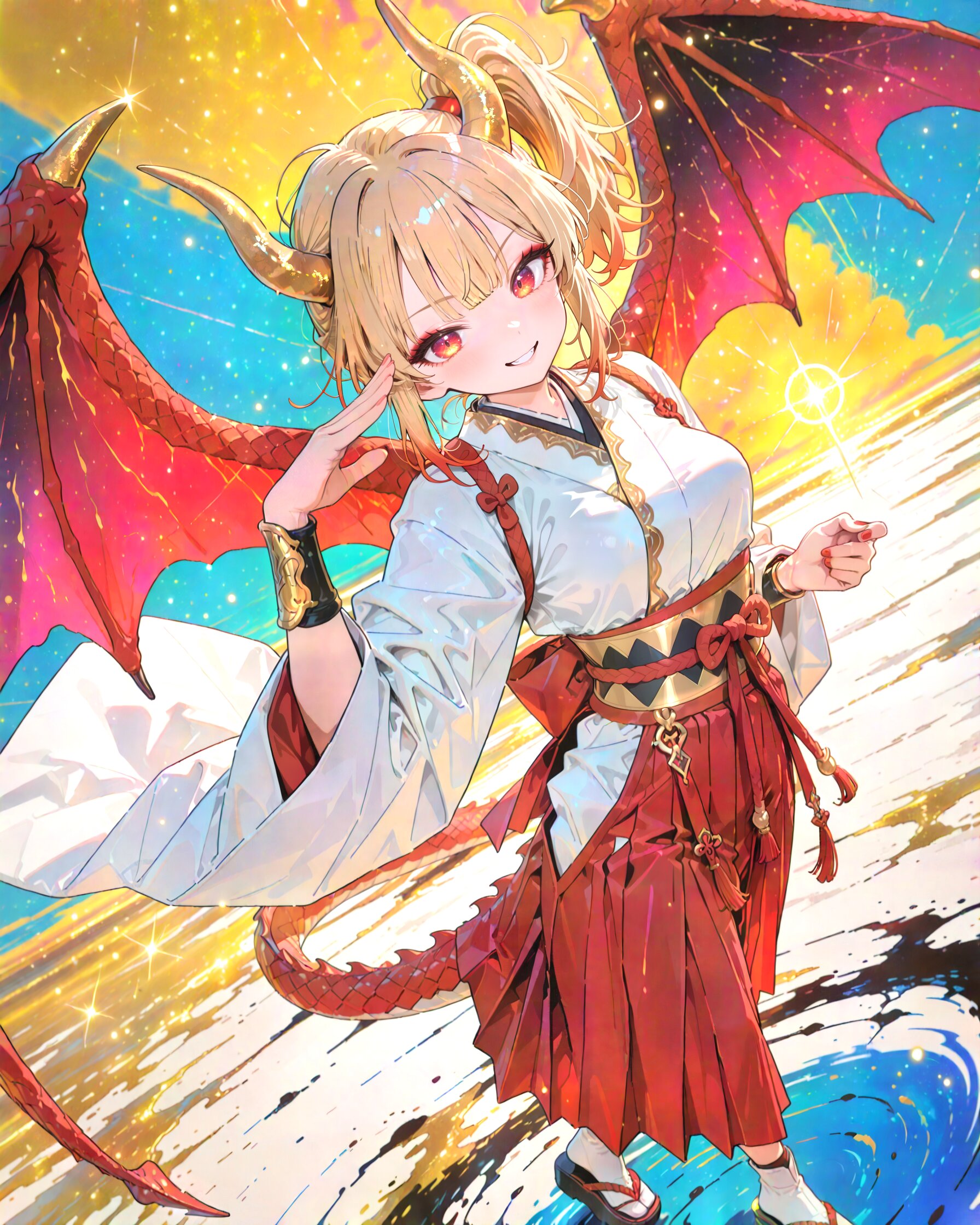 super fine concept art, hard surface, 8K, masterpiece, best quality, amazing quality, very aesthetic, absurdres, from front, from a distance, looking afar (from above,looking up:1.0) , (dutch angle:1.2), looking at viewer, The silhouette is composed of dynamic, polka dot and vibrant rhombus. The background is a solid, creating a striking contrast with the intricate, multi-colored design of the character, summer atmosphere. 1dragon girl, solo, dragon girl, 18yo, (2dragon gold horns attached to the head:1.2), (blonde hair:1.2) medium hair half updo hair up (side ponytail:1.3), red eyes beautiful iridescence eyes, (eyeshadow:1.2), cute, beautiful, (muscle,buff well-built body,ultra-detailed muscle:0.6) , first-rate female bodies perfect body framed breasts smart hips Average height, red nail polish, a dragon tail (2long red dragon wings on back:1.2), (red hakama:1.0) (overskirt:1.0) (White Japanese Clothes:1.0), sarashi inner, (White wide sleeve:1.0) gold and white stripe obi, bracer, straw sandals, tabi, (shiny smile), fighting smile, eye trail,, clapping, The background is a solid, bright ultramarine, creating a striking contrast with the intricate, multi-colored design of the character, (dancing silhouette:1.0), pop color background, (high saturation:1.2), summer coloring, partly black ink wash effect, professional art lots of details, , overexposure, shiny-glistening, (watercolor style:0.0), (pastel color style:0.0) 4ur4_illu,shiny, glowing, glowing particles, glowing light particles, light particles, ultramarine wind , <lora:noline (1):-0.5> <lora:sdxl2-flat2-512b:0.0> <lora:facelightup_xl_v10:0.5> <lora:V2_yakumo_alchemy:0.4> <lora:Aura_illu:0.2>