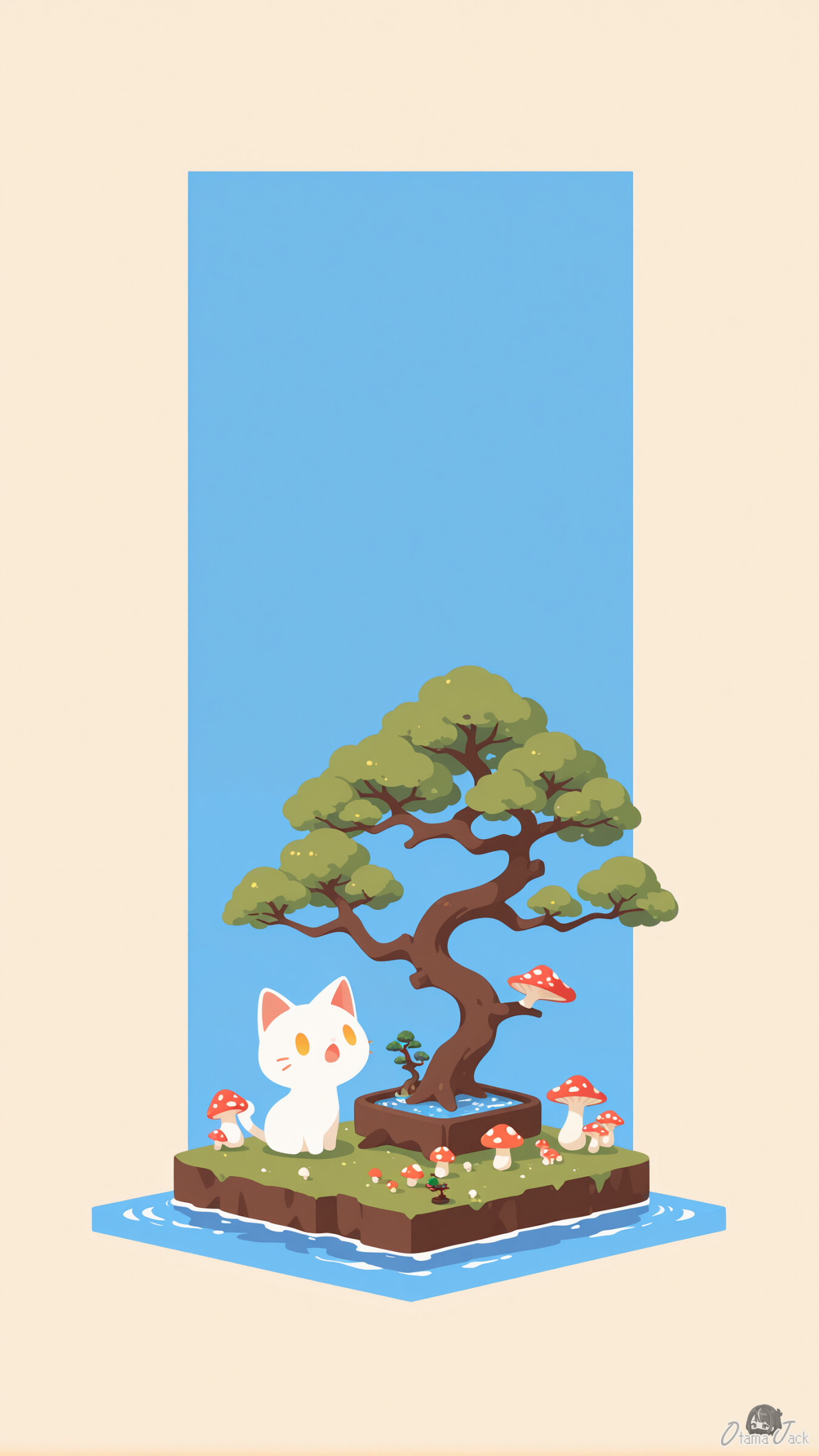 chibi, 1cat,mushroom cat, river, blue sky, relax, open mouth, mushroom tree, (no human:1.6),(bonsai:1.2), no lineart,no outline,