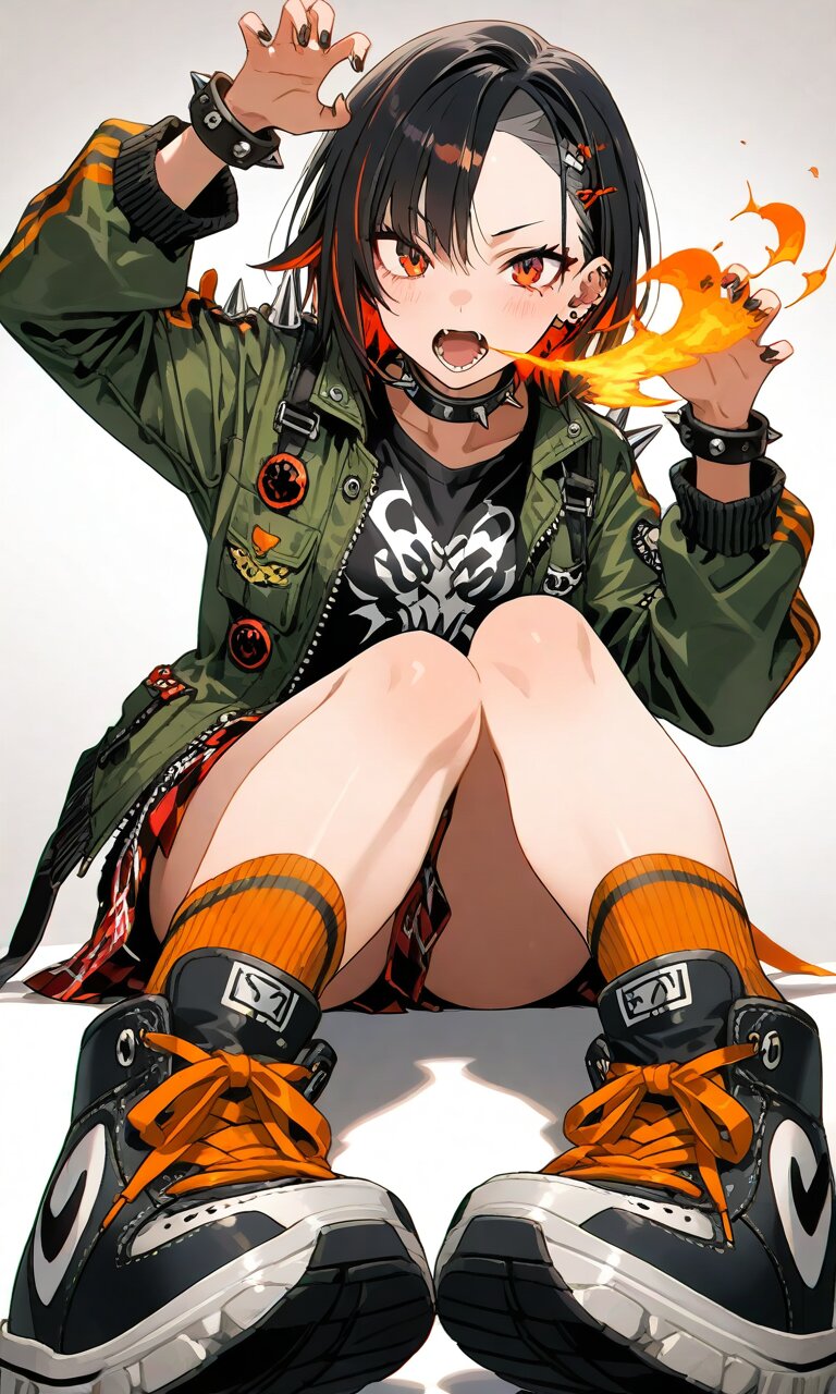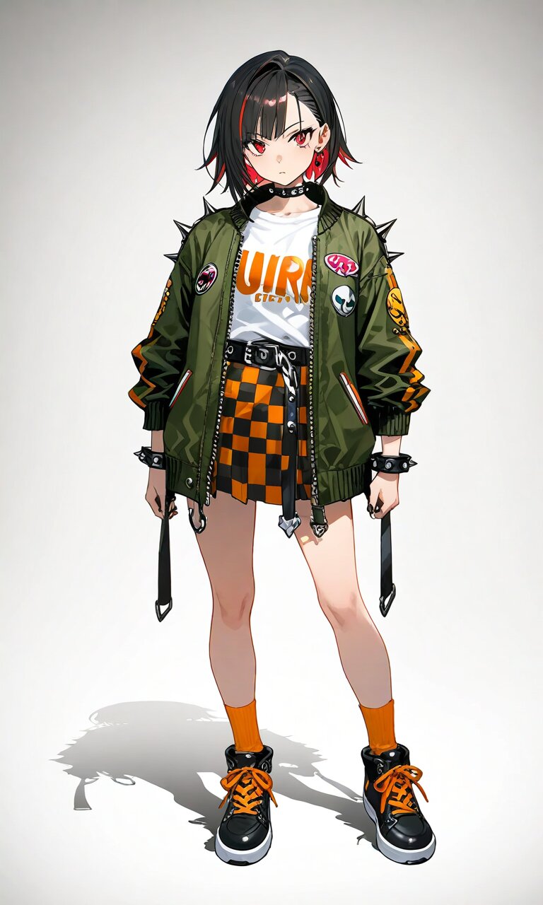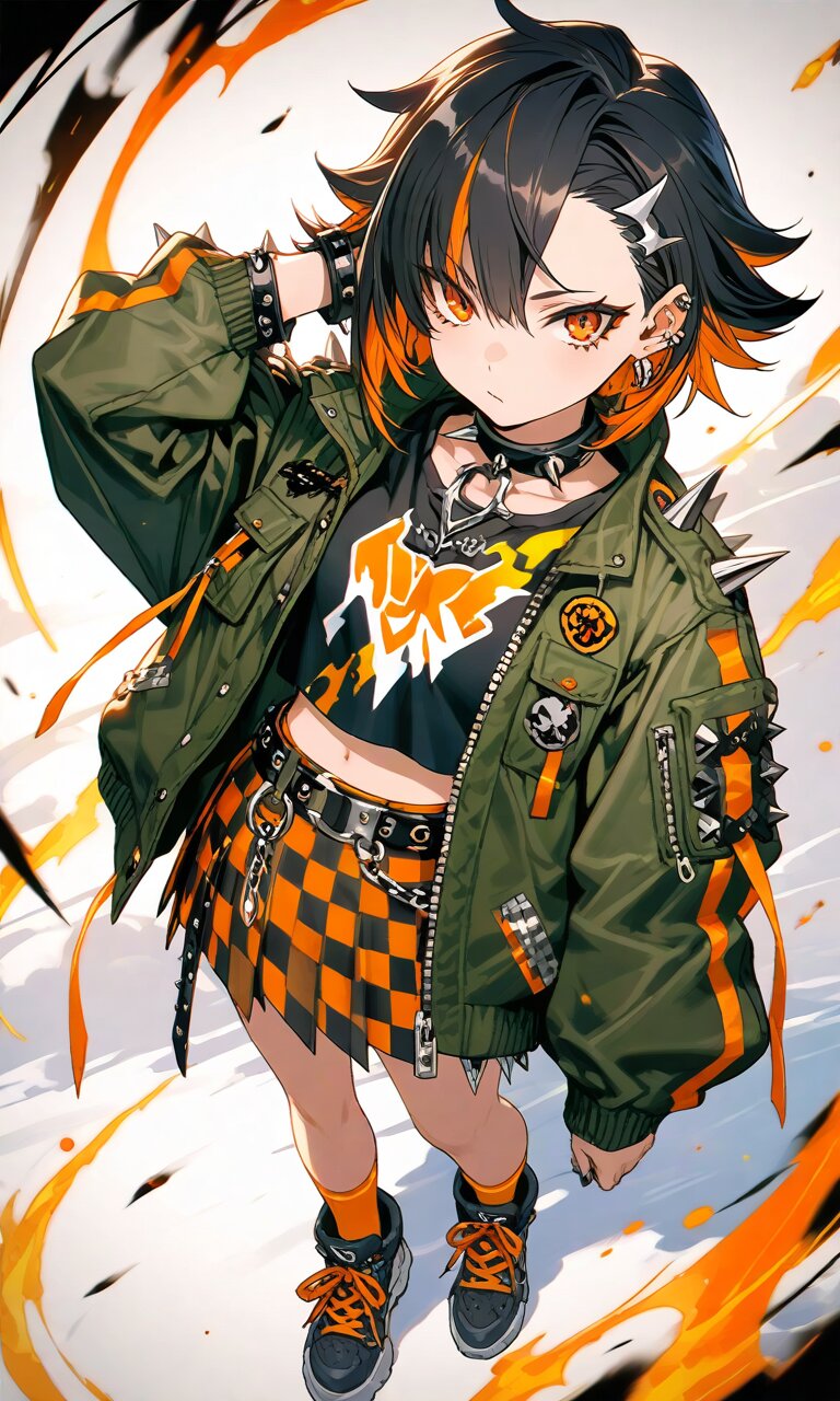 green jacket with orange line on sleeves, open jacket, shoulder spikes, spiked bracelet, spiked choker, checkered skirt with orange stripes, orange socks, black sneakers with orange laces,