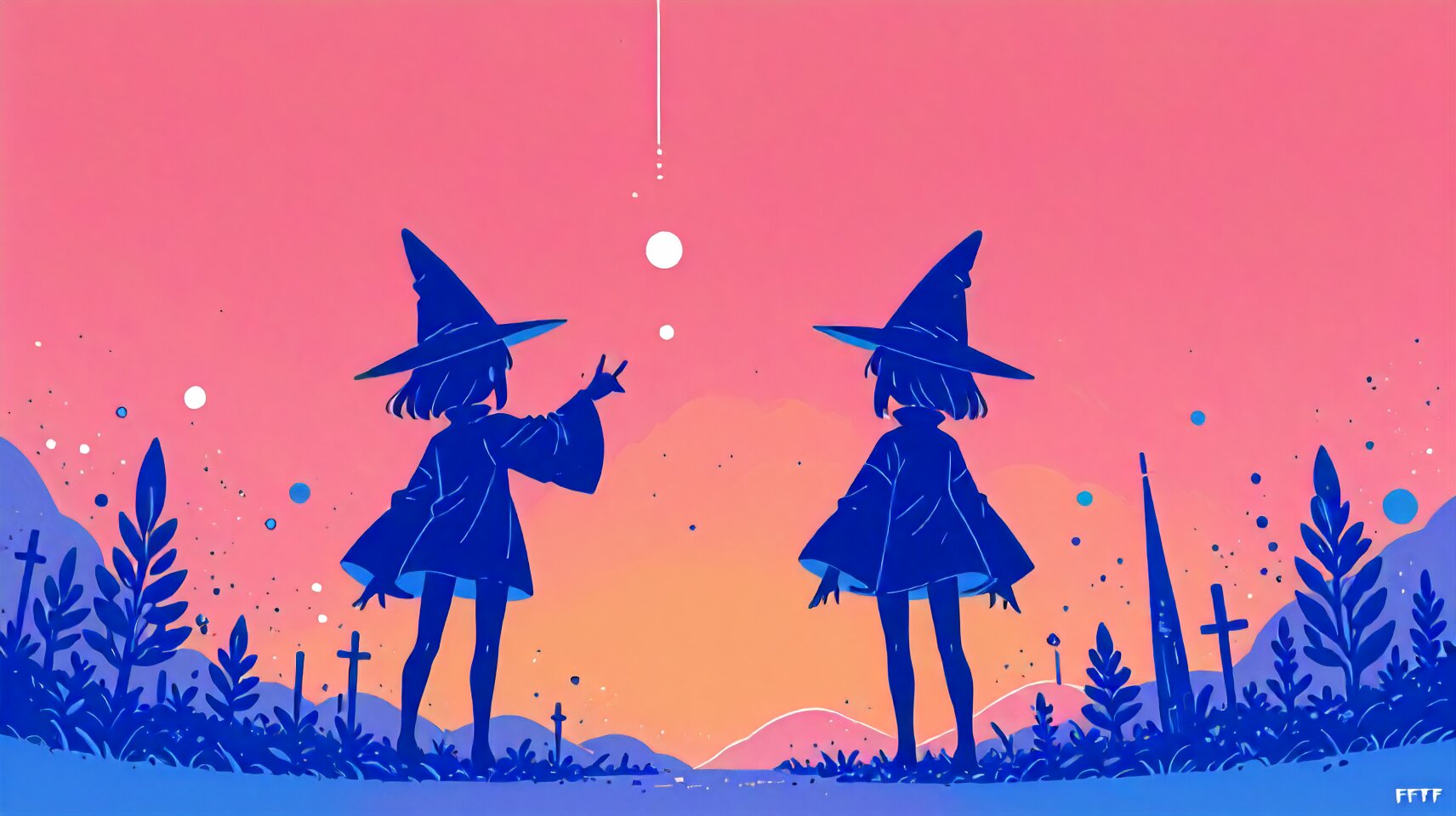 minimalist flat style illustration, faceless, no facial features, flat color design, vector art style, pastel color scheme, silhouette look, soft color background, clean lines, simple composition, modern graphic design <lora:flatline_v2_-_Illus_x_Niji:1> <lora:MinimalistFlatColorXL_byKonan:1>, 1girl, black mage \(fft\), happy, dynamic pose, cinematic angle, solo, fox shadow puppet, from behind, looking at another