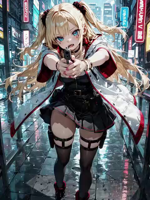 A beautiful anime girl with long blonde twin-tails, blue eyes, wearing a black pleated mini skirt, thigh holsters with guns, black thigh-high stockings, futuristic jacket with red accents, standing in a neon-lit rainy cyberpunk street at night, wet reflective street surface, neon signs in Japanese, anime style, ultra high quality, 24fps, highly detailed, cinematic lighting, intense atmosphere, mouth fixed, A woman with a closed mouth, calm and composed, no facial movement, no lip movement, serene and still expression, subtle head tilt, [0s-2s]: She stands still, feet shoulder-width apart, carefully adjusting her stance and posture, breathing steadily, both hands firmly holding the pistol, eyes narrowing with focus [2s-4s]: She aims directly at the target, firing two or three semi-automatic shots with bright muzzle flashes, each shot followed by strong but controlled recoil, upper body and arms subtly moving to counter the force, hair and jacket swaying slightly from recoil, maintaining perfect balance throughout [4s-5s]: She lowers the pistol slowly, relaxing her stance, taking a deep breath, expression softening as tension fades