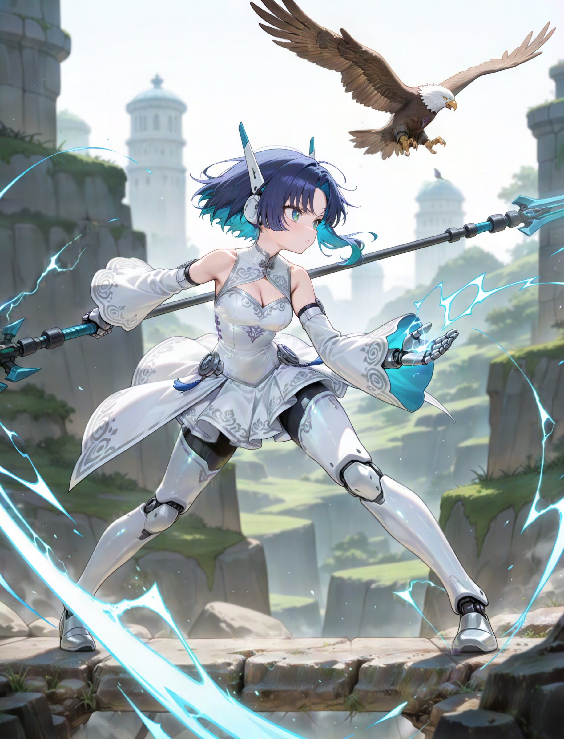 1girl, huge cool polearm in hands, holding huge cool weapon mechanism, machine, (aerial view:1.0), (Surveillance viewpoint:1.0) (25 years old:1.0), (medium breasts:1.2), (two-tone hair, purple and gentian blue hair, short hair, asymmetrical sidelocks,curtained hair , :1.0), (beautiful face:1.1), (clear white small eyes:1.0), green pupils , fighting stance, kung fu attack, kung fu pose, kung fu action, , (mechanical hands:1.0), mechanical legs, robot ears, neon trim, medieval times fantasy world, (cybernetic gynoid:1.0), (mech suit:1.0), (white gothic cuirass:1.0), (doll joints:1.0), (white gorgeous modest wizard's dress skirt:1.1), glossy silver body with metallic luster cyborg, (Decorative embroidery:1.0), (white gorgeous dress:1.1), (overskirt:1.0), (white sleeve:1.2), electrokinesis, (looking away:1.0), from side, (moss green silhouette of eagle,serious monster silhouette:1.0), In the Italian Dolomites, a landscape of rocky peaks and stunning Alpine scenery., blurry background, super fine concept art, hard surface, 8K, masterpiece, best quality, amazing quality, very aesthetic, absurdres, professional art lots of details, , overexposure, sumie effect style, <lora:noline (1):-0.5> <lora:sdxl2-flat2-512b:-1.0> <lora:facelightup_xl_v10:0.5>