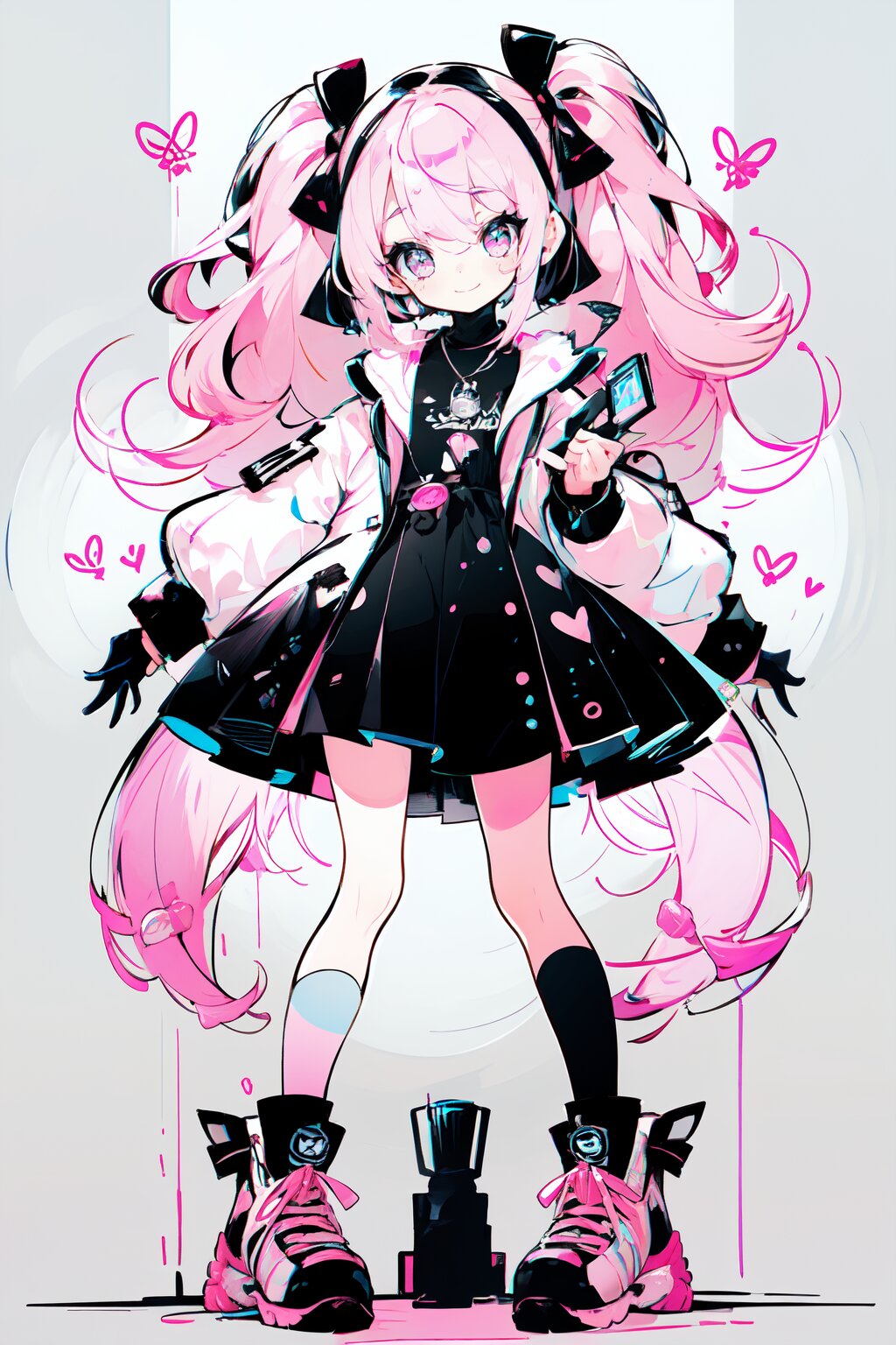 absurdres,detailed and intricate, (best quality), BREAK,perfect proportion,solo,(1girl),happy smile, BREAK,pink hair, BREAK,black eyes, BREAK,(black,pink:1.5), (dynamic Angle,dynamic pose),