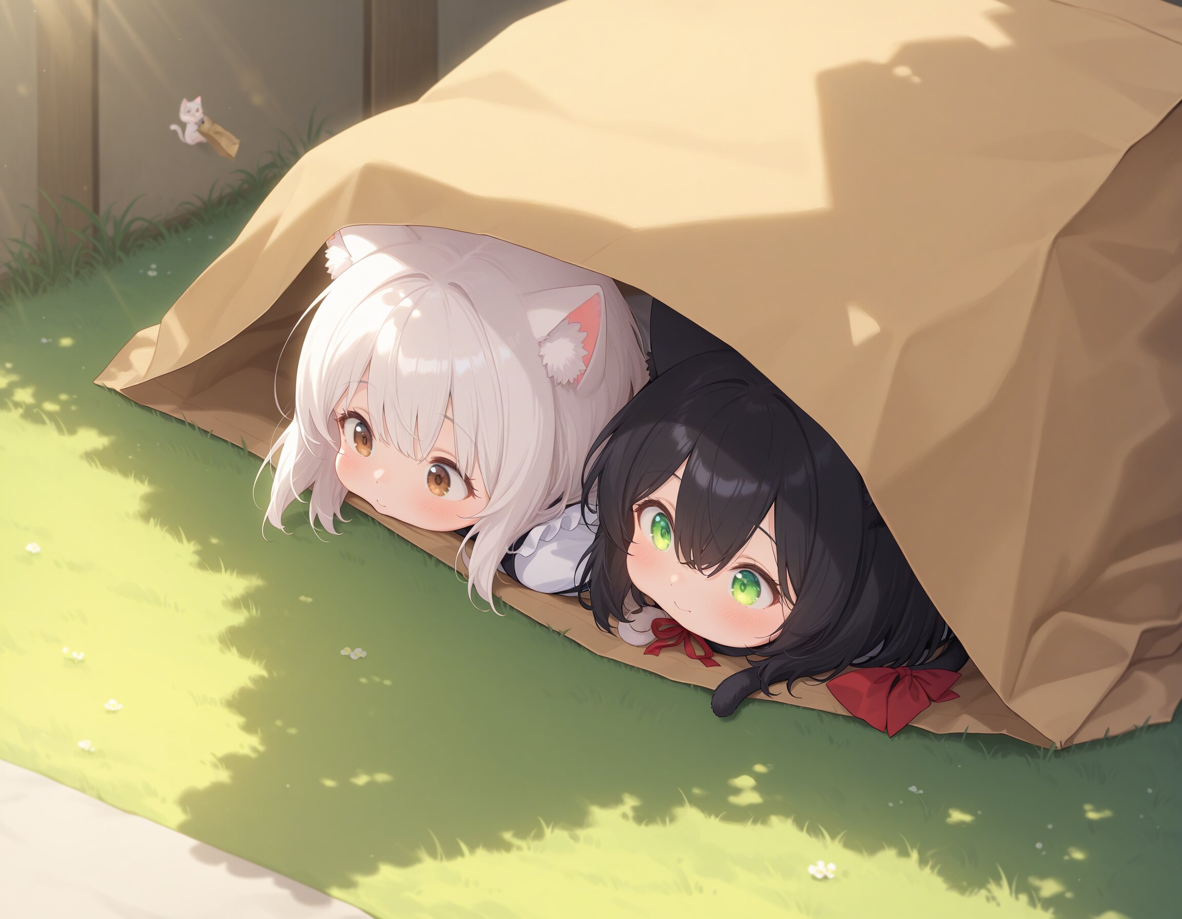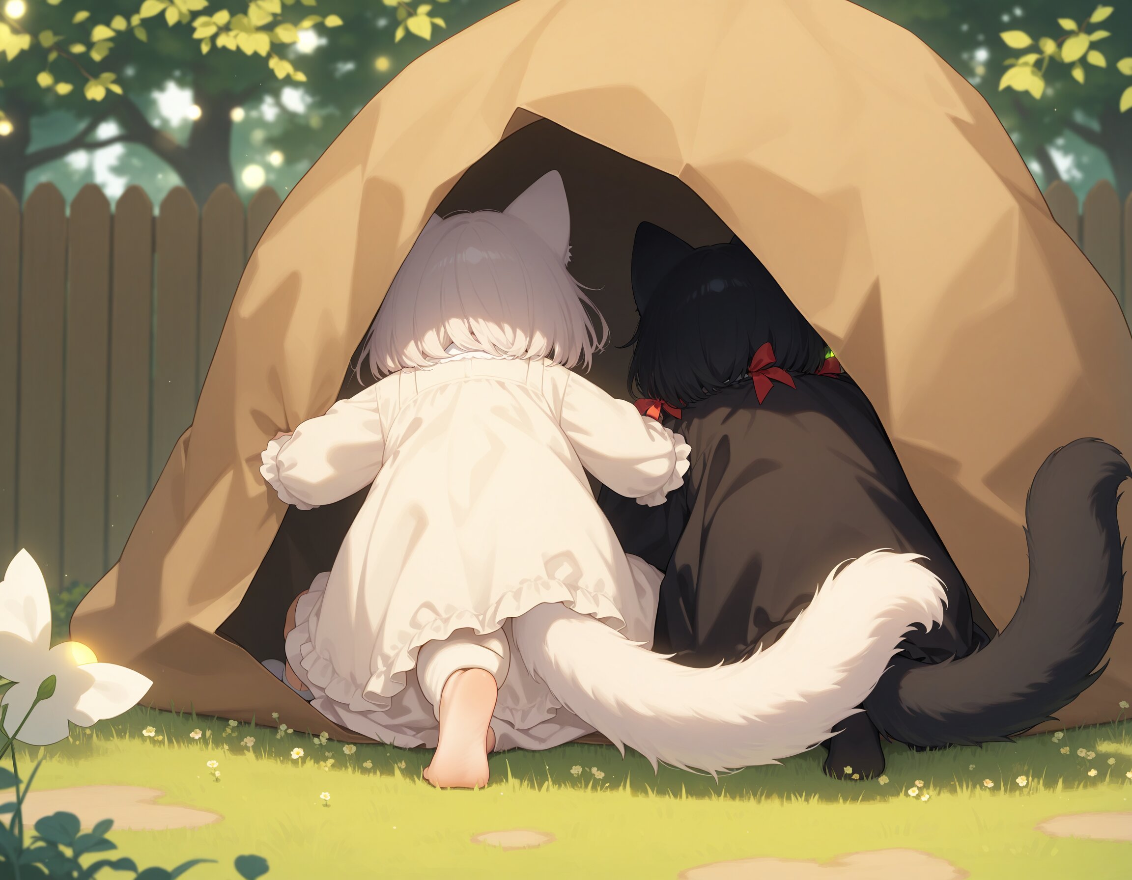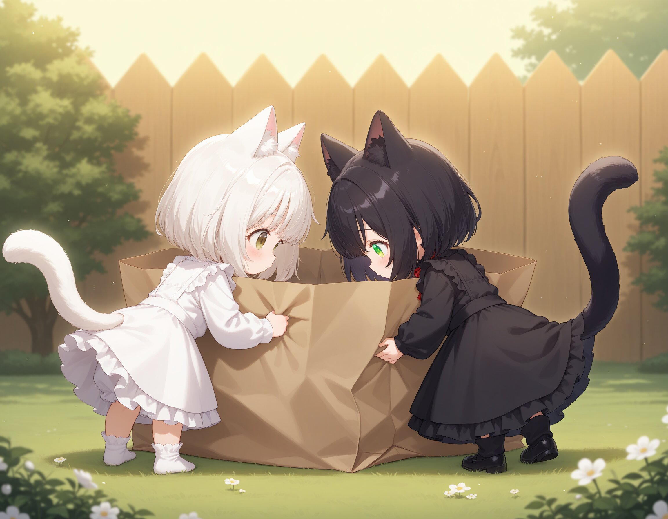 2girls, mid, safe, masterpiece, best quality, very aesthetic, absurdres, perfect anatomy, 8k, extremely detailed, official art, extremely detailed eyes and face, ultra-detailed background, Very delicate and textured costumes, Vibrant colors, High transparency, backyard, large paper bag, slightly open paper bag, only cat tails visible, two fluffy cat tails, one pure white and fluffy, one black and sleek, soft sunlight, warm outdoor setting, playful and heartwarming scene, soft shadows, subtle lighting effects, anime aesthetic, whimsical atmosphere, expressive character interactions, tiny girls, hidden inside the paper bag, only tails visible, swaying tails, playful and curious, cute and mischievous, childlike innocence, subtle movement, natural body language, Interesting, exciting, glowing eyes, fun, BREAK white-haired girl, short hair, brown eyes, white cat ears, frilly white pinafore dress, white socks, delicate ruffles, BREAK black-haired girl, short hair, green eyes, black cat ears, gothic lolita outfit, red ribbon,