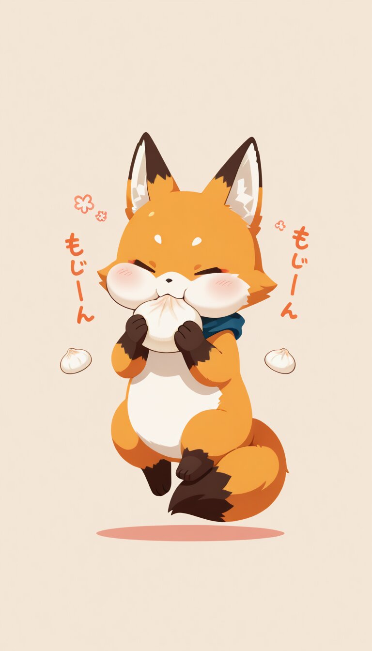 chibi, 1 furry, solo ,fox, (no human:1.6),baozi, food, puffy-cheeks, puffy cheeks, eating, no lineart,no outline,