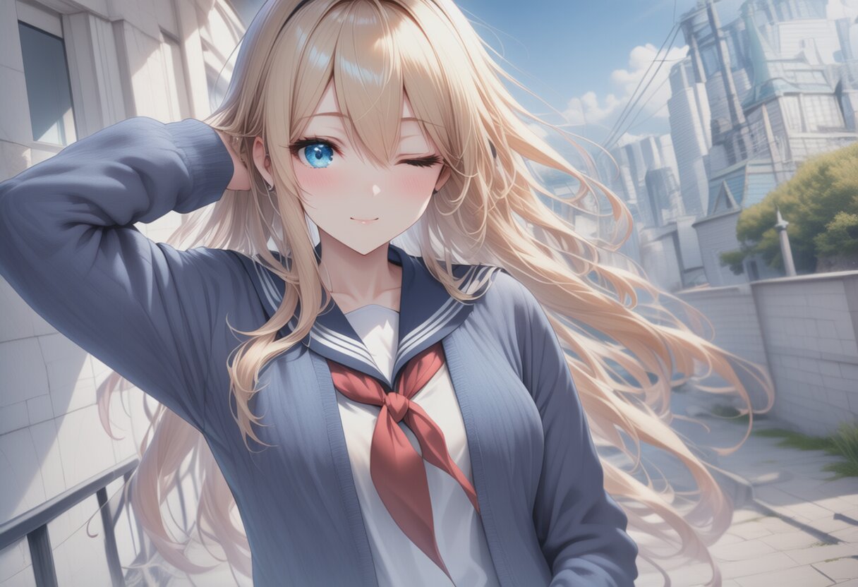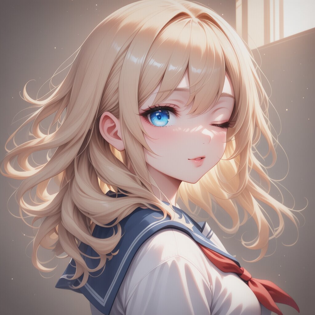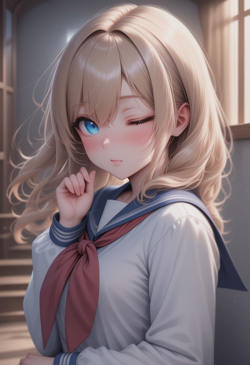 {{{highly detailed}}}, {{{8k resolution}}}, {{{beautiful detailed}}}, {{intricate}}, {{{detailed beautiful eyes, detailed beautiful face, detailed beautiful face and eyes}}}, 1girl, solo, style of ai-generated, {{{{school white uniform, blue sailor suit, red sailor ribbon, long sleeves}}}}, blonde hair, hair between eyes, blue eyes, shiny wavy hair, {{strong light coming in}}, one eye closed, {{{upper body}}}, {{{masterpiece}}}, {{{best quality}}}, {{{very aesthetic}}}, {{{ultra-detailed}}}, {illustration}, {{{extremely detailed}}}, {{{an extremely delicate and beautiful}}}