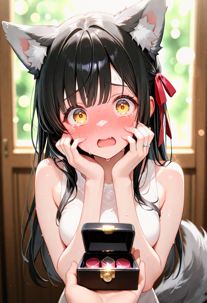 1girl,solo,kawaii,teenager,fair_skin,black hair,bangs,straight_hair,skinny,wolf ears,medium breasts,long hair,yellow eyes,tareme,wolf tail,red ribbon,hair ribbon, full-face blush,tears,Amazed,sweat,open mouth,hands_on_own_face, blurry,bokeh,depth of field,looking at viewer,ring box,upper body,marriage proposal,pov,pov hands,general,safe,, <lora:Fixhands_anime_bdsqlsz_V1:1>, appropriate posture,appropriate configuration,ideal ratio body proportions,perfect anatomy, masterpiece,best quality,newest,absurdres,highres,ultra high res,8K UHD,hyper-detailed,