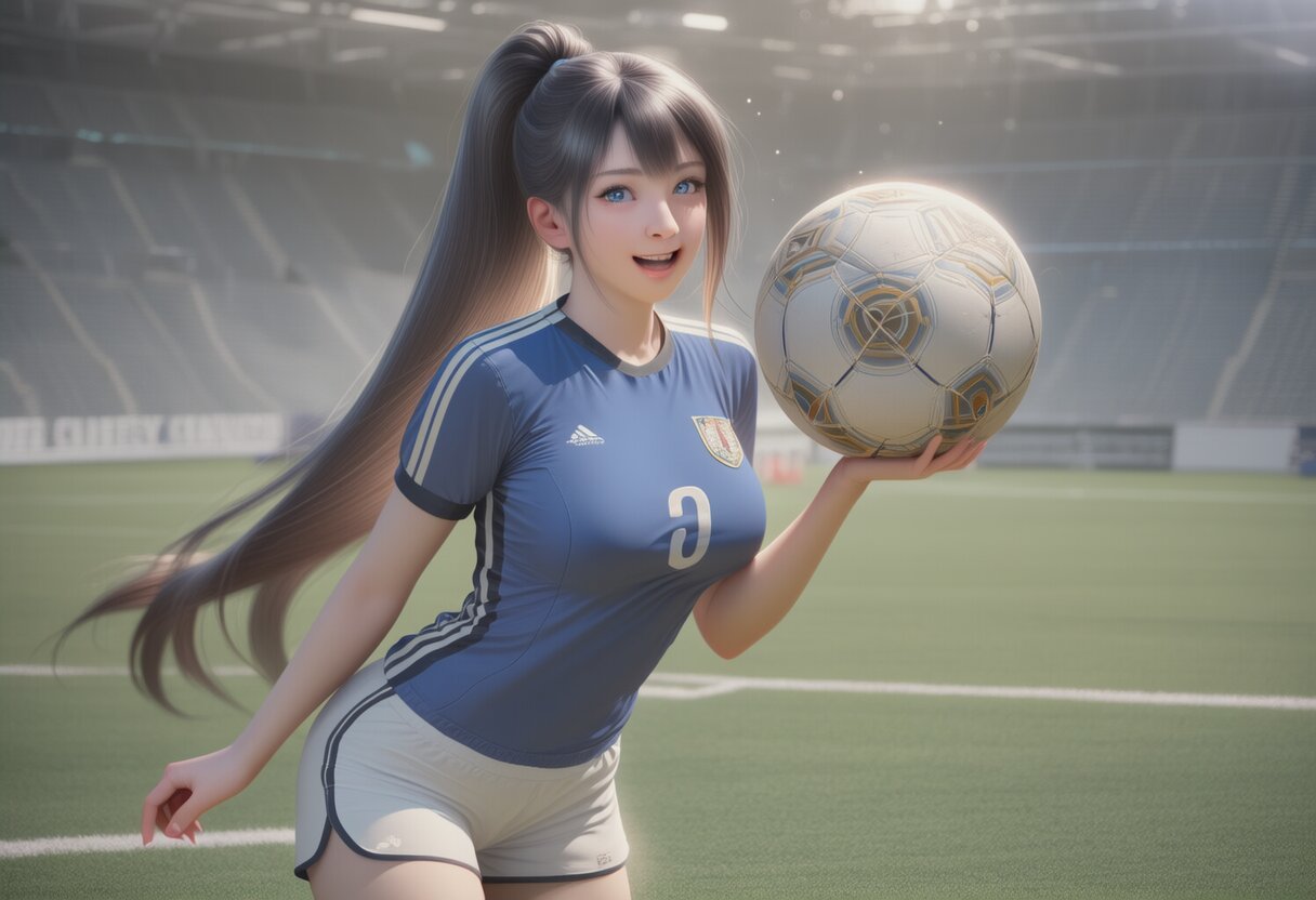 perfect photo realistic (medium), professional lighting, ultra high definition, perfect realistic slim face, perfect realistic hair, lifelike, intricate, overall detail, realistic, hyperrealistic, style of ai-generated, {{{highly finished}}}, rating:sensitive, adult theme, mature theme, {{{detailed beautiful eyes, detailed beautiful face, detailed beautiful face and eyes}}}, 1girl, solo, blue eyes, very long hair, black hair, hair between eyes, high ponytail, large breasts, smile, open mouth, {{{soccer uniform, blue uniform, white shorts}}}, soccer field, {{holding a soccer ball}}, cowboy shot, standing, {{{masterpiece}}}, {{{best quality}}}, {{{very aesthetic}}}, {{{ultra-detailed}}}, {illustration}, {{{extremely detailed}}}, {{{an extremely delicate and beautiful}}}