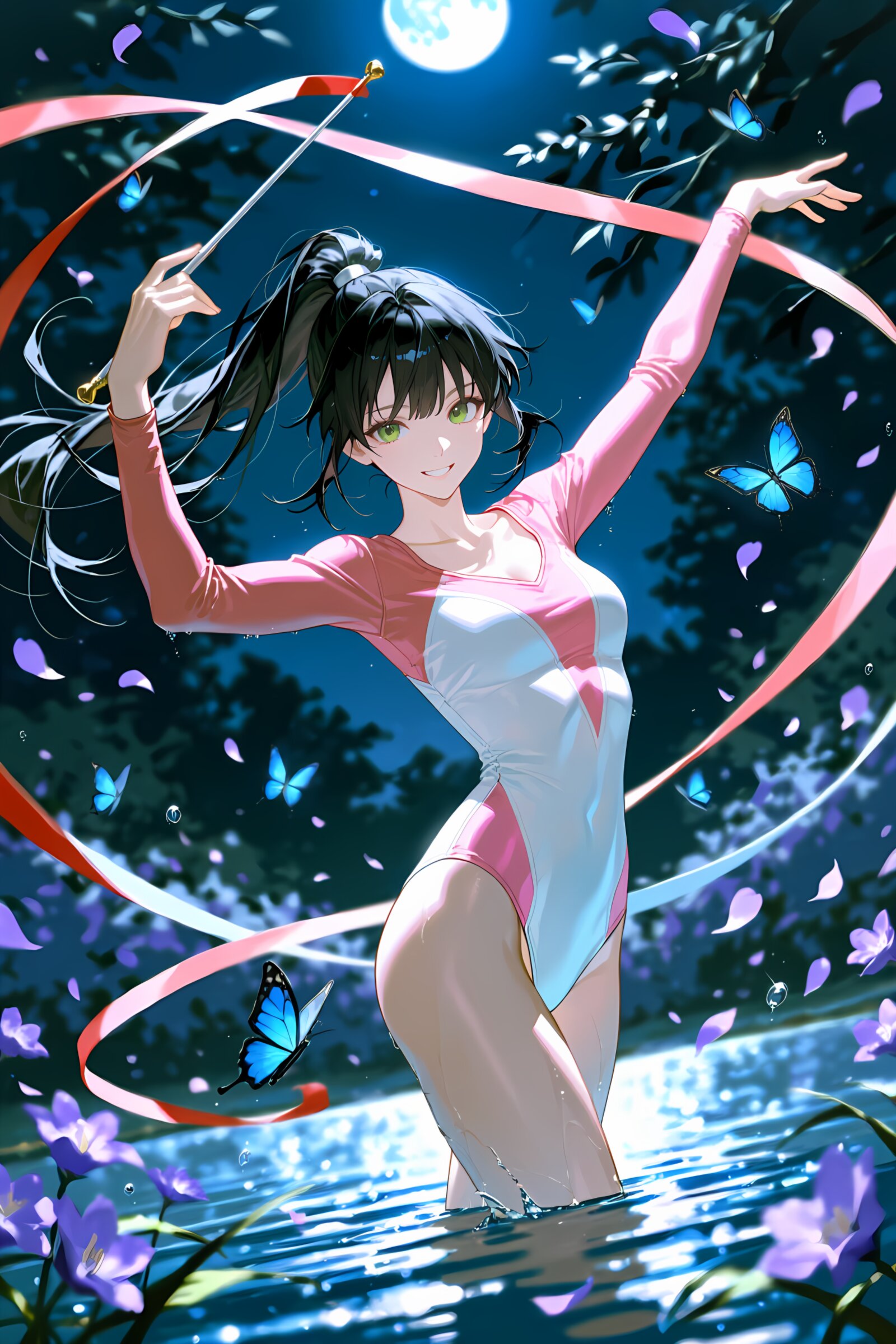 ((4k, 8k, Ultra HD)), (masterpiece:1.2), (best quality:1.2), (detailed:1.5), (detailed background:1.5),少女をクローズアップ、最高クラスのイラスト、神絵師クラスの描き込み、色鮮やかなタッチの明るい色調、カラフル、シネマティックな光、斜めに傾いた画角、シャープでクリアな実写風のイラスト。ポートレイト風味で背景はぼやけている。ダイナミックなアングル。ローアングルからの迫力ある眺め。幻想、月、月明かり、湖。幻想的な夜のにある湖の浅瀬で、月明かりを浴びながら、一人の少女がリボンを回して新体操の動きをしている。彼女は黒髪の長い髪を後頭部で一つに束ねており、ピンク色と白色が混ざった新体操用のハイレグレオタードを着ている。少女は水面に立っており、足元からは波紋が広がっている。躍動感のある鮮やかな動き。楽しそうに微笑んでいる。瞳は緑色。風の動きで髪の毛は宙になびいている。空には満月が輝いており、まるでこの世の場所ではないくらい幻想的な空間。さらに紫色の花びらが空間を舞っており、少女の動きに合わせて渦巻いている。たくさんの水色の蝶々が飛んでいる。スレンダーな体型ながら引き締まった筋肉質な肉体、強調された胸、お尻、ふともも、胸の谷間。