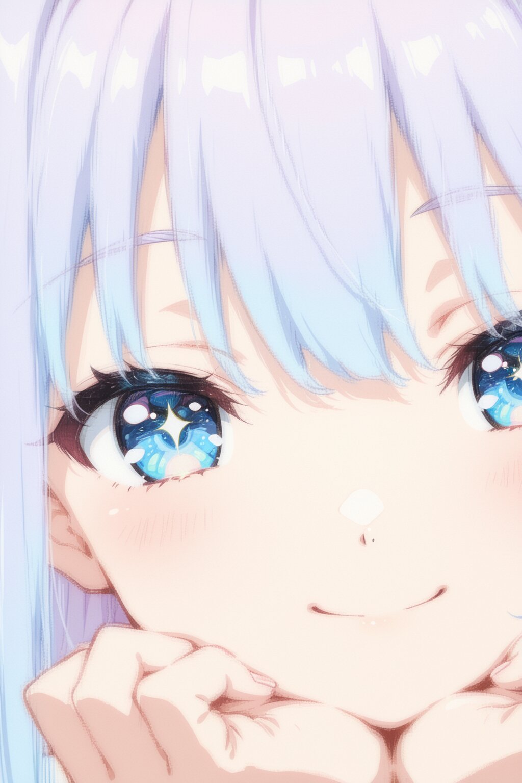 masterpiece, best quality, anime style, close-up portrait, cute anime girl resting her chin on both hands, soft smile, large sparkling eyes, long flowing light purple hair with light blue inner highlights, detailed hair strands, white background, simple flat colors, cel-shading, colorful lineart, clean illustration, heart symbol floating nearby, playful and sweet mood, symmetrical pose, masterpiece, best quality, soft pastel color palette, thin delicate lineart, pale colors, watercolor texture, matte finish, subtle shading, minimal contrast,