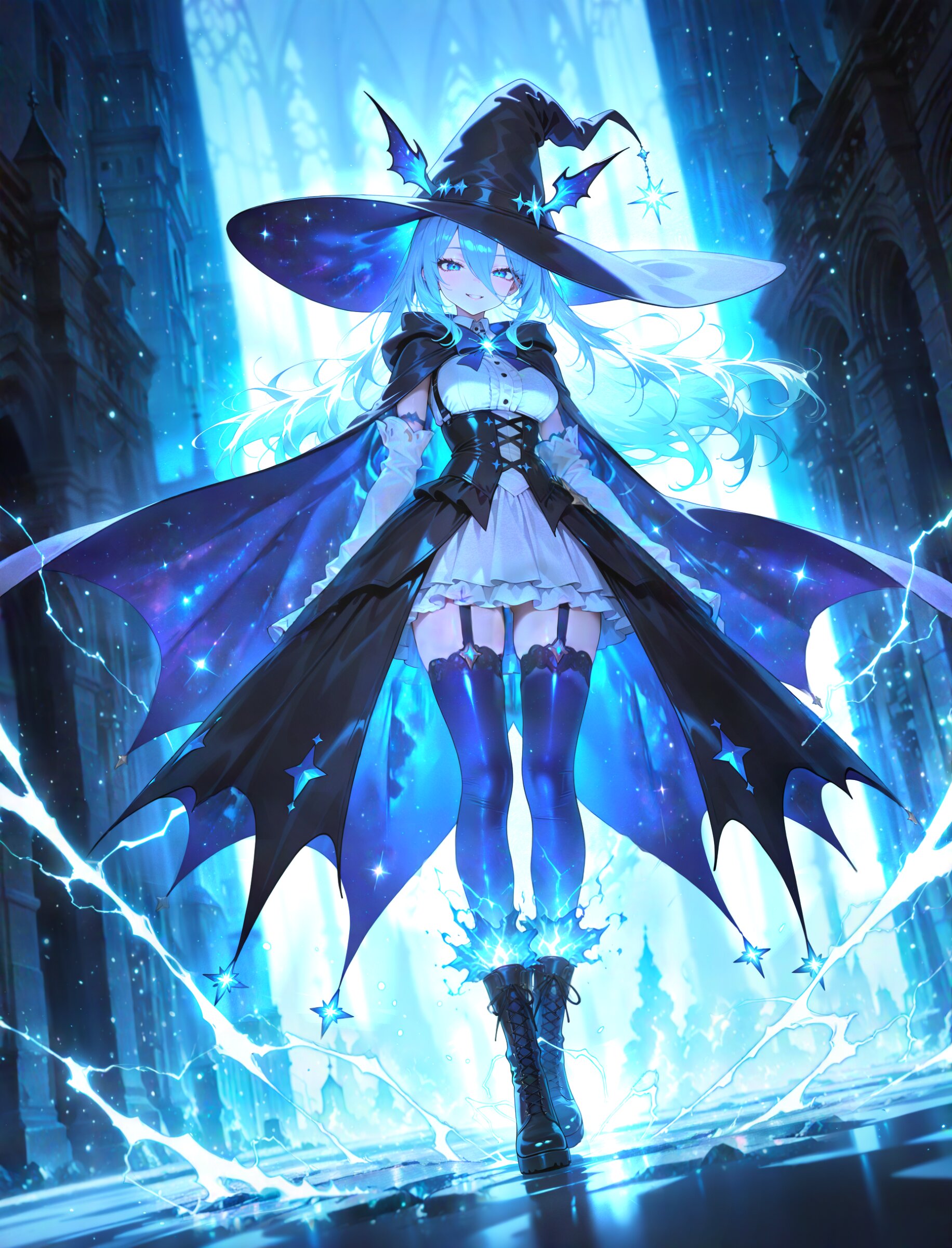 oblique angle,first person view , 1girl, witch girl, blue eyes, beautiful iridescence eyes, beautiful detailed eyes, beautiful light blue hair, long bangs, long disheveled beautiful hair, first-rate female bodies, perfect body, beautiful breasts, framed breasts, cool face, (Beautiful Lips:0.7),, (stylish beautiful witch dress:1.2), white elbow gloves, (cute dark blue and white witch girl costume:0.9), (white blouse:1.3), bow tie, witch long skirt (overskirt:1.1) black cloak, (blue galaxy witch hat:1.1), lace-up boots on feet, stockings and suspenders,, mysterious face, cool,seductive smile , ice magic, magical sparkle, powering up, aura, electricity, dim lighting, , super fine concept art, hard surface, 8K, unreal engine, masterpiece, best quality, amazing quality, very aesthetic, absurdres you can add scenery, (volumetric lighting), To make the background more distinctive. professional art lots of details, , overexposure, shiny-glistening, (watercolor style:0.5), (pastel color style:1.0) 4ur4_illu,shiny, glowing, glowing particles, glowing light particles, light particles, , <lora:noline (1):-0.5> <lora:sdxl2-flat2-512b:0.2> <lora:facelightup_xl_v10:0.5> <lora:V2_yakumo_alchemy:0.5> <lora:Aura_illu:0.1>