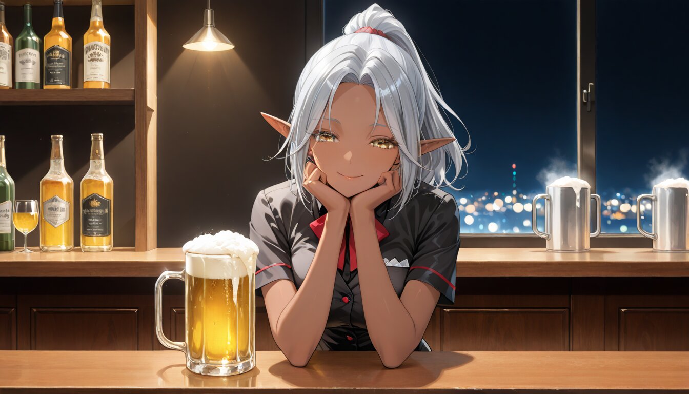 score_9, score_8_up, score_7_up, source_anime, masterpiece, amazing, very aesthetic, high resolution, ultra-detailed, absurdres, newest, scenery, 2d, semi-realistic, moe heroine, anime-style, sharp focus, sfw:1.2, (gaze at me with an Mischievous Smile, indoors, (1female character, solo, no humans), cowboy shot, from the front, (close-up eyes, face focus). background is a bar with a quiet atmosphere, (on a midnight:1.2, dim lighting, dark background, no sunlight, nighttime ambiance), a mug of chilled golden beer on a bar counter, frosty glass, condensation, refreshing. she wears Authentic bartender uniform, short sleeve, she is Elegant, Graceful. dark elf woman, golden eyes, Moist eyes, (dark skin:1.4), dark-skinned female:1.4, (ponytail, shine silver hair:1.3),